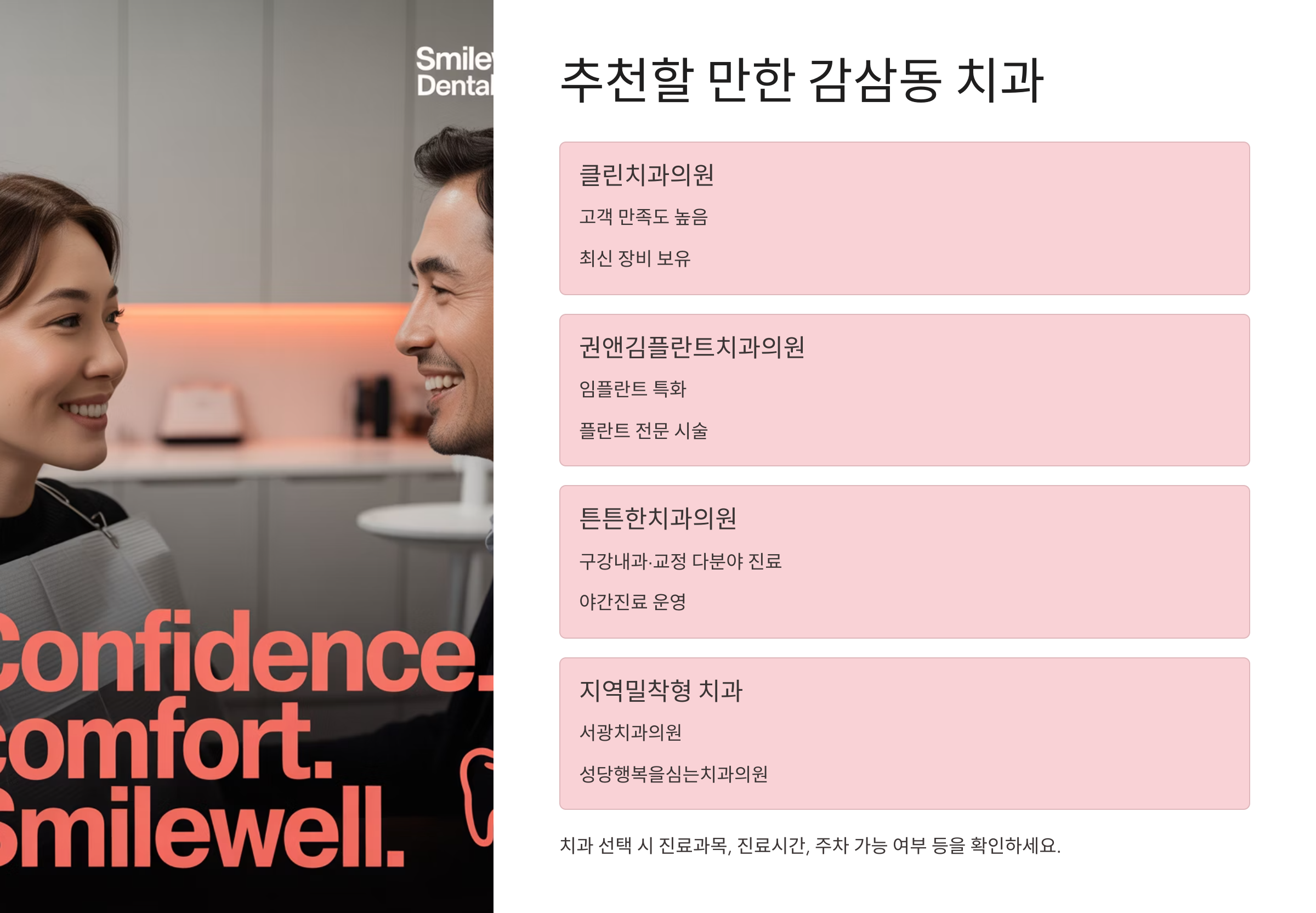 감삼동의 치과는 단순한 충치 치료부터 교정, 임플란트, 심미치료까지 다양하게 진행하고 있어요. 특히 전문 분야에 따라 차별화된 진료를 제공하는 곳이 많기 때문에 내게 맞는 치과를 찾는 게 중요해요. 어떤 치료가 필요한지에 따라 병원을 선택하는 기준도 달라져야 하죠.