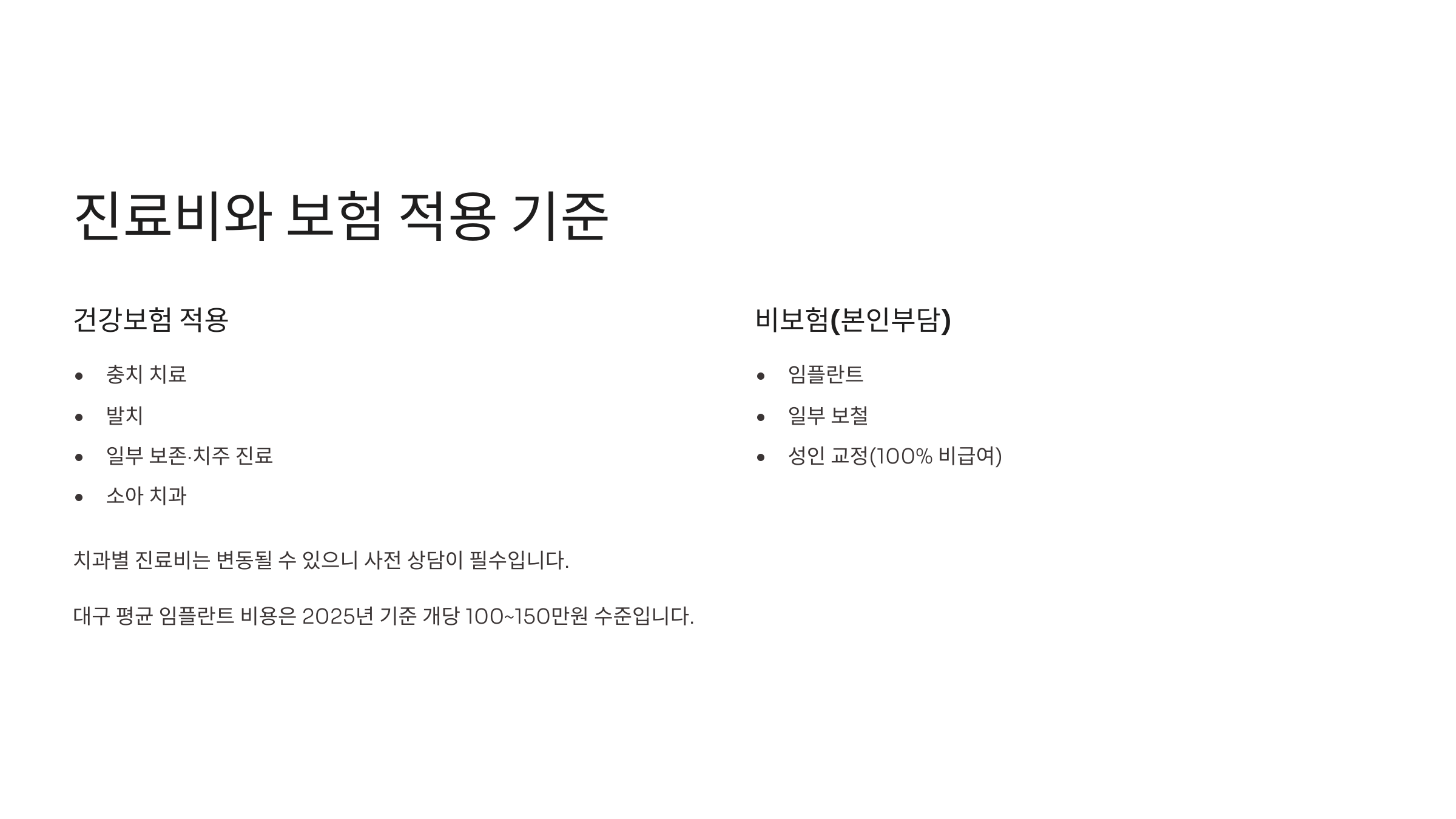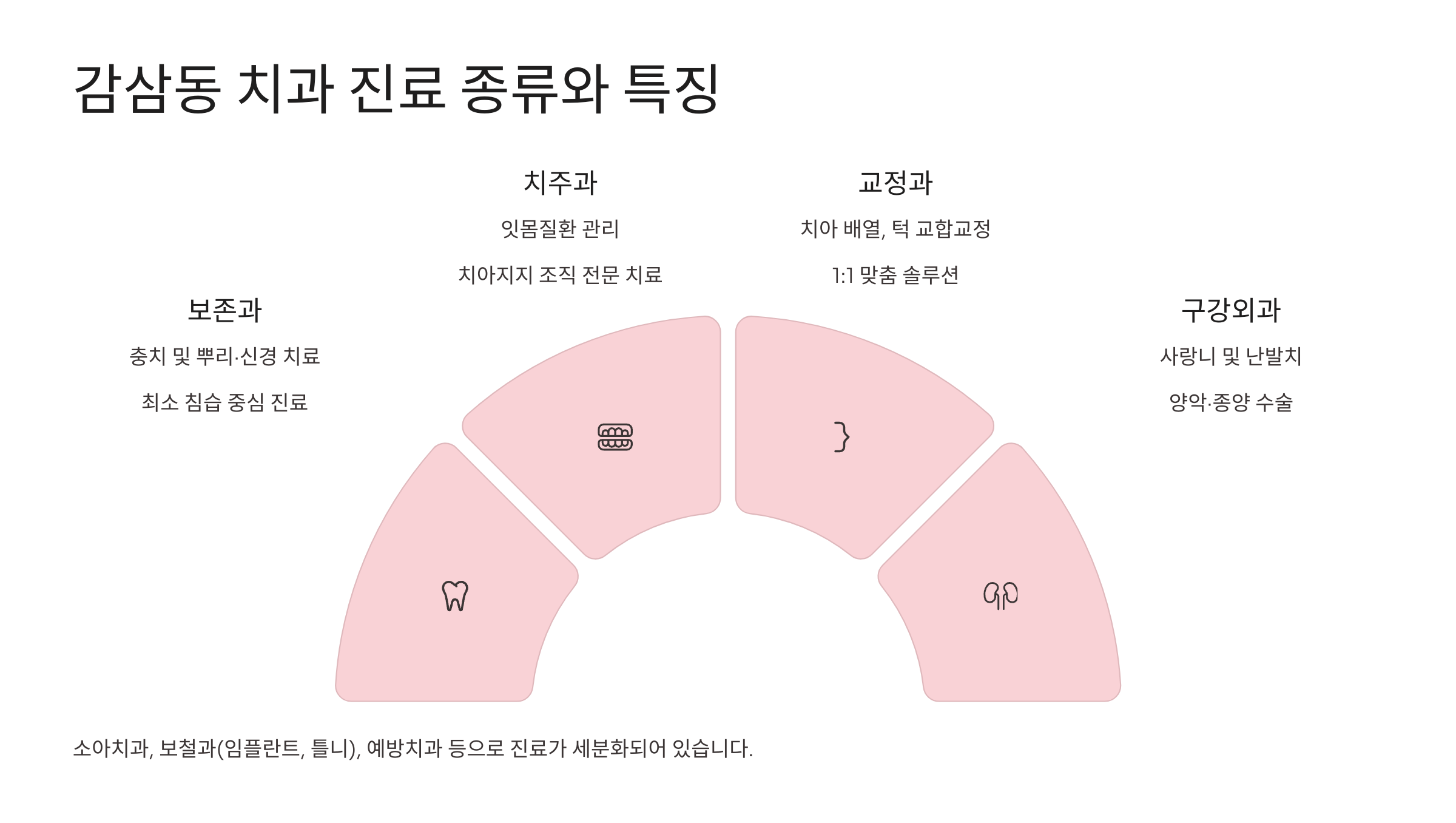 치과 진료 종류와 특징 치과 진료는 크게 예방, 보존, 보철, 교정, 심미, 외과 등으로 나뉘어요. 가장 흔히 접하는 것은 충치 치료와 스케일링 같은 기본 진료인데요, 감삼동의 대부분 치과는 이 기본 진료를 매우 탄탄하게 잘하고 있어요. 특히 정기 스케일링은 건강보험 적용도 가능해서 부담 없이 다닐 수 있죠.