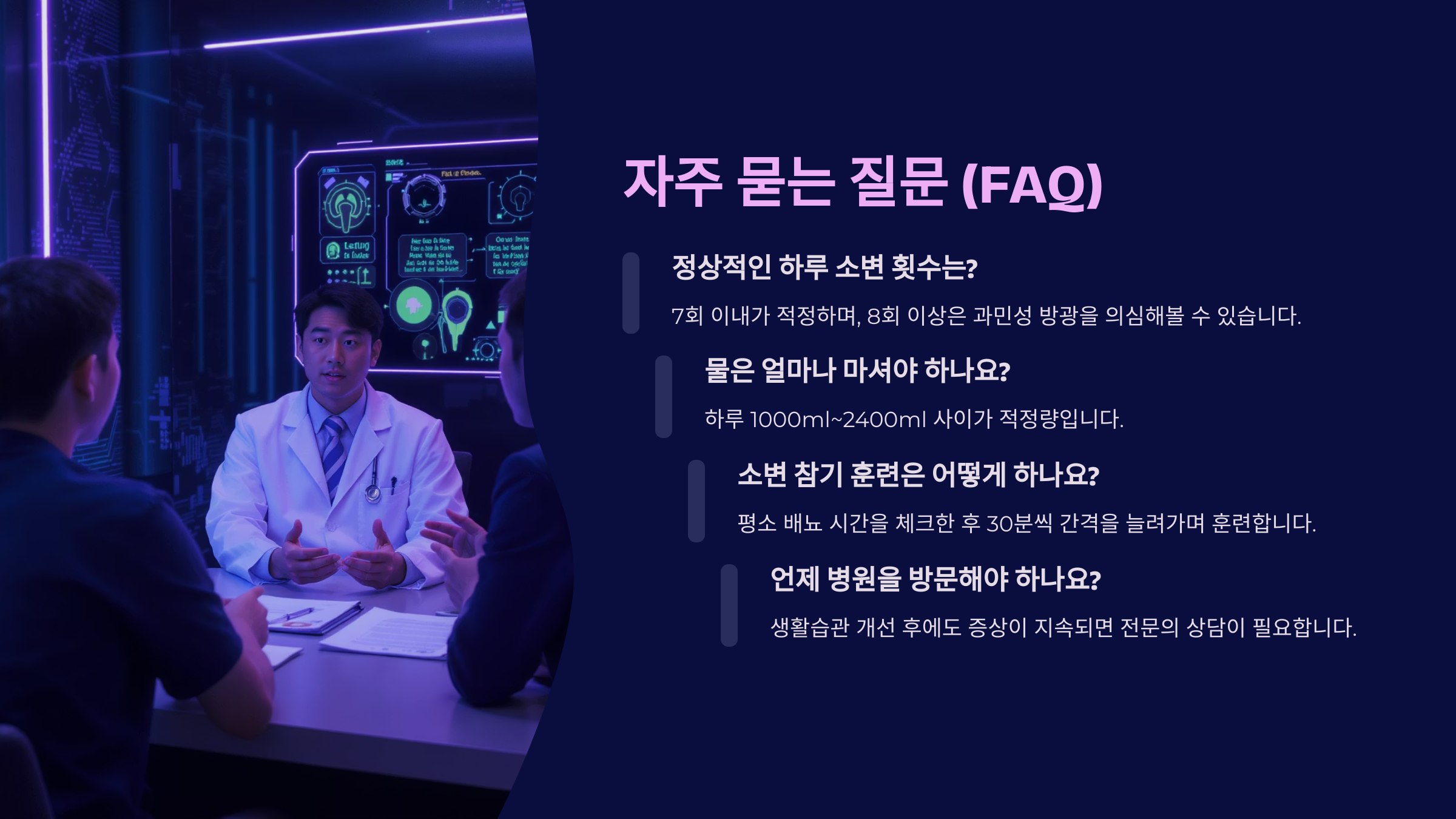 Q1. 소변을 자주 보는 게 꼭 병원에 가야 할 정도로 심각한가요?A1. 하루 8회 이상, 밤에도 자주 깨는 증상이 반복되면 병원 진료를 받는 게 좋아요. 특히 통증이나 참기 어려운 요의가 동반되면 방광 질환일 수 있어요.