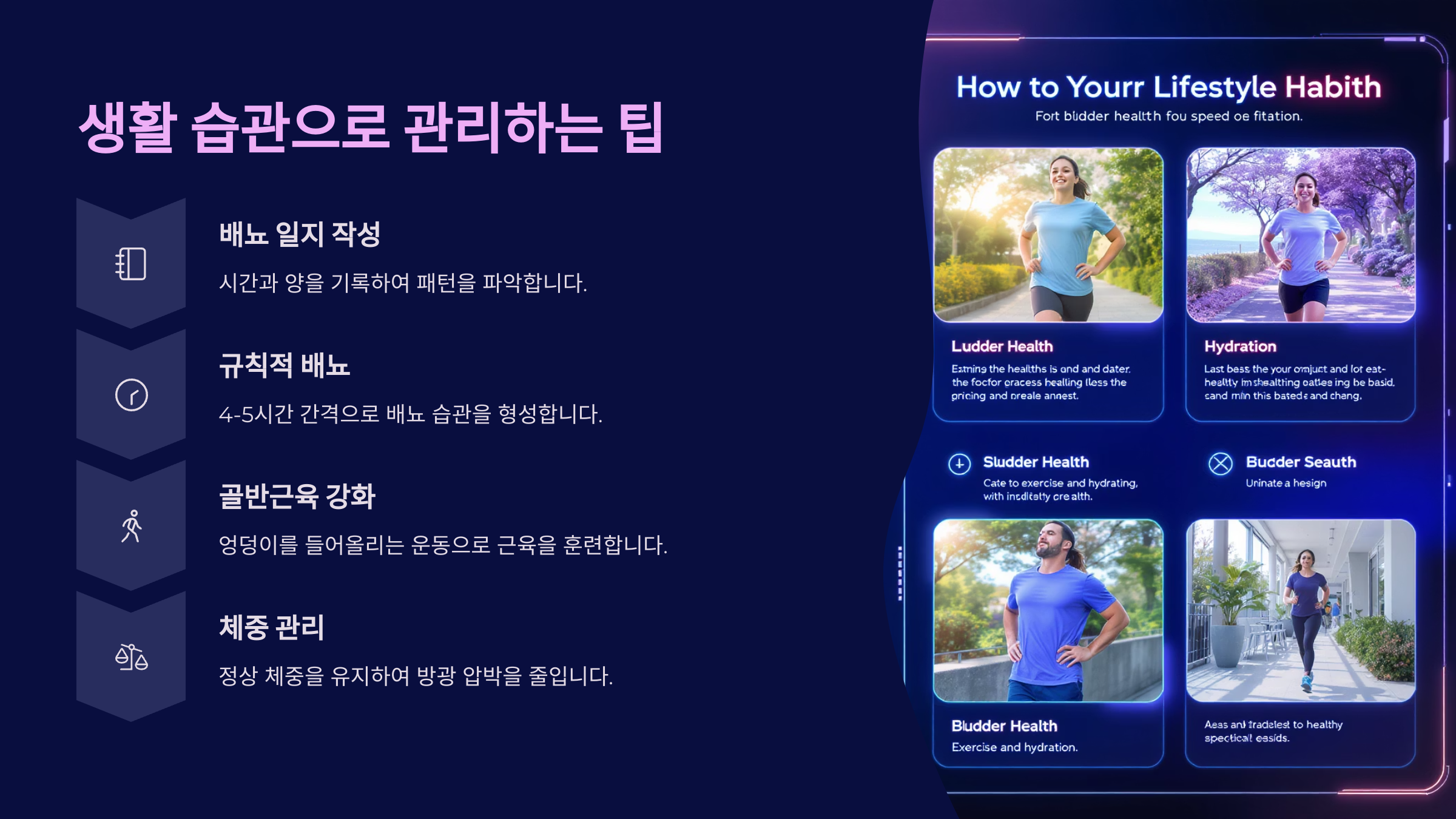 또, 골반저 근육 강화 운동인 케겔 운동은 요실금이나 절박뇨 증상 완화에 정말 효과적이에요. 방광을 직접 조절하긴 어렵지만, 이를 지탱하는 근육을 강화하면 큰 도움이 돼요. 하루에 3세트 이상 꾸준히 해보세요.