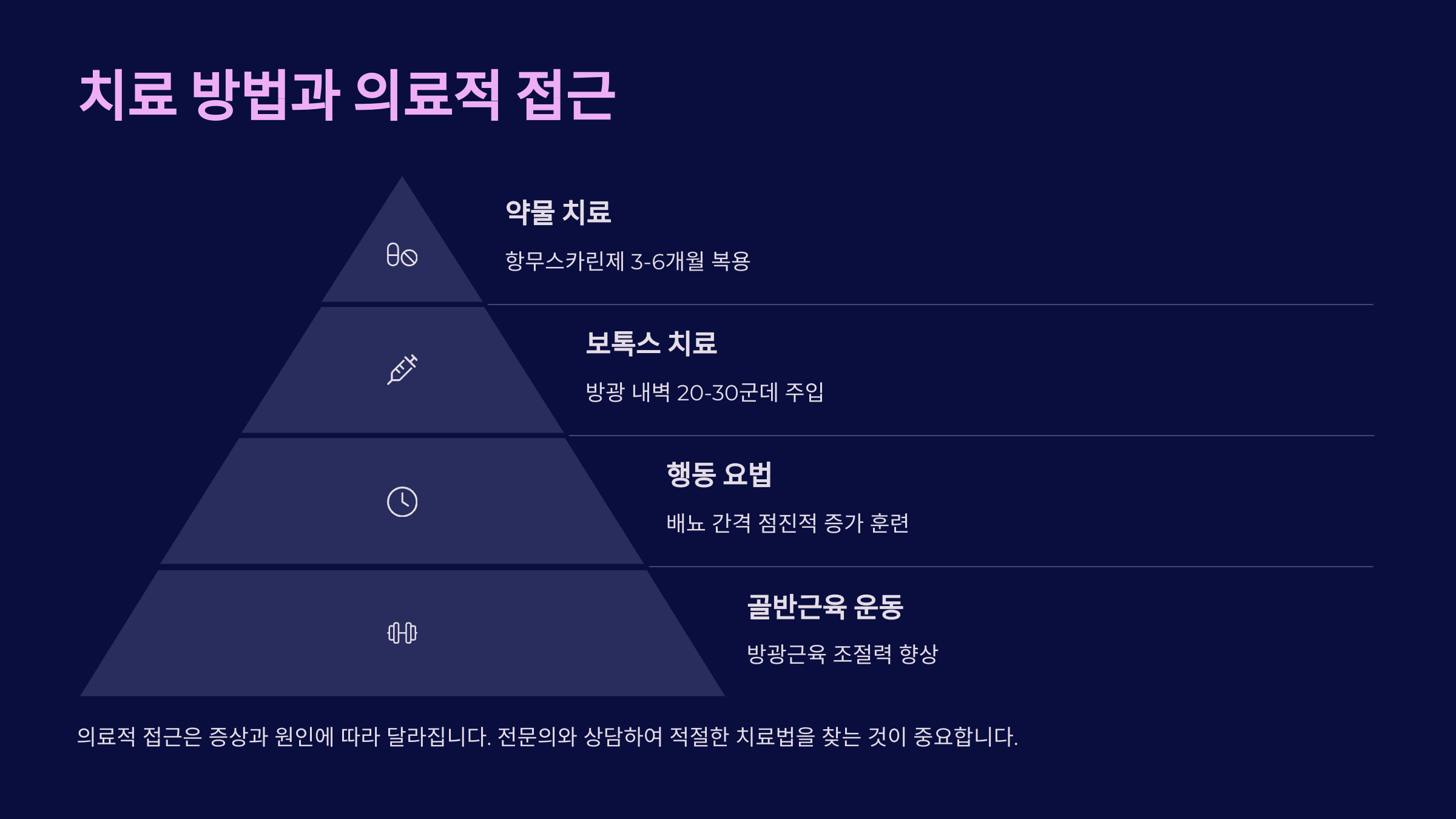 소변을 자주 보게 되는 증상이 일상생활에 영향을 준다면 반드시 치료가 필요해요. 가장 먼저 할 일은 전문 의료기관에서 정확한 진단을 받는 거예요. 증상의 원인에 따라 치료법이 달라지기 때문이에요.과민성 방광일 경우엔 약물치료가 기본이에요. 항콜린제나 베타-3 작용제 같은 약을 써서 방광 근육의 과도한 수축을 조절해줘요. 약물은 주로 2주 이상 꾸준히 복용해야 효과가 나타나요.