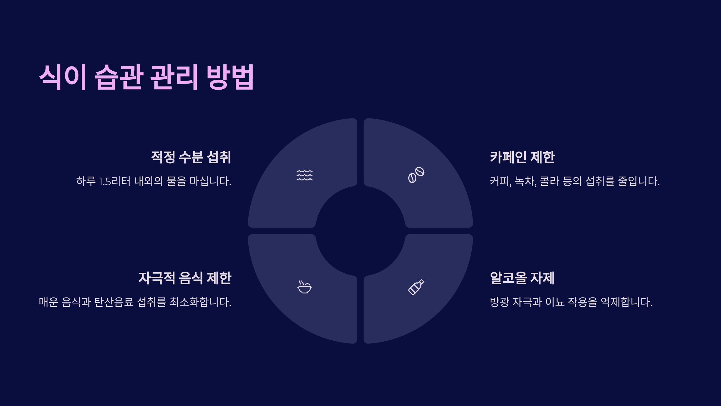 수분 섭취는 적절하게 유지하는 게 좋아요. 너무 적게 마시면 요로 감염 위험이 높아지고, 너무 많이 마시면 오히려 증상이 악화될 수 있어요. 하루 1.5~2리터 정도가 적당해요. 특히 카페인이나 탄산음료, 알코올은 방광을 자극하니 피하는 게 좋아요.