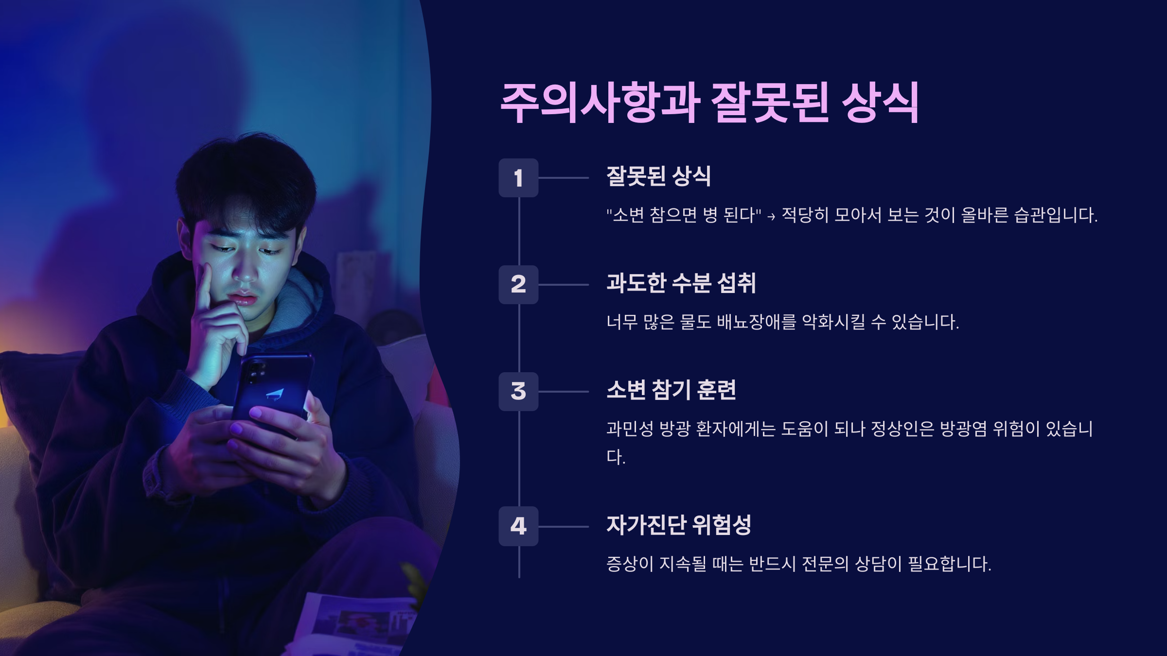 '참으면 방광에 좋다'는 말도 오해예요. 물론 방광 훈련처럼 시간을 조절하는 건 도움이 되지만, 무리하게 참는 건 방광벽에 무리를 줘서 기능을 떨어뜨릴 수 있어요. 소변은 일정 주기마다 비워주는 것이 가장 좋아요.