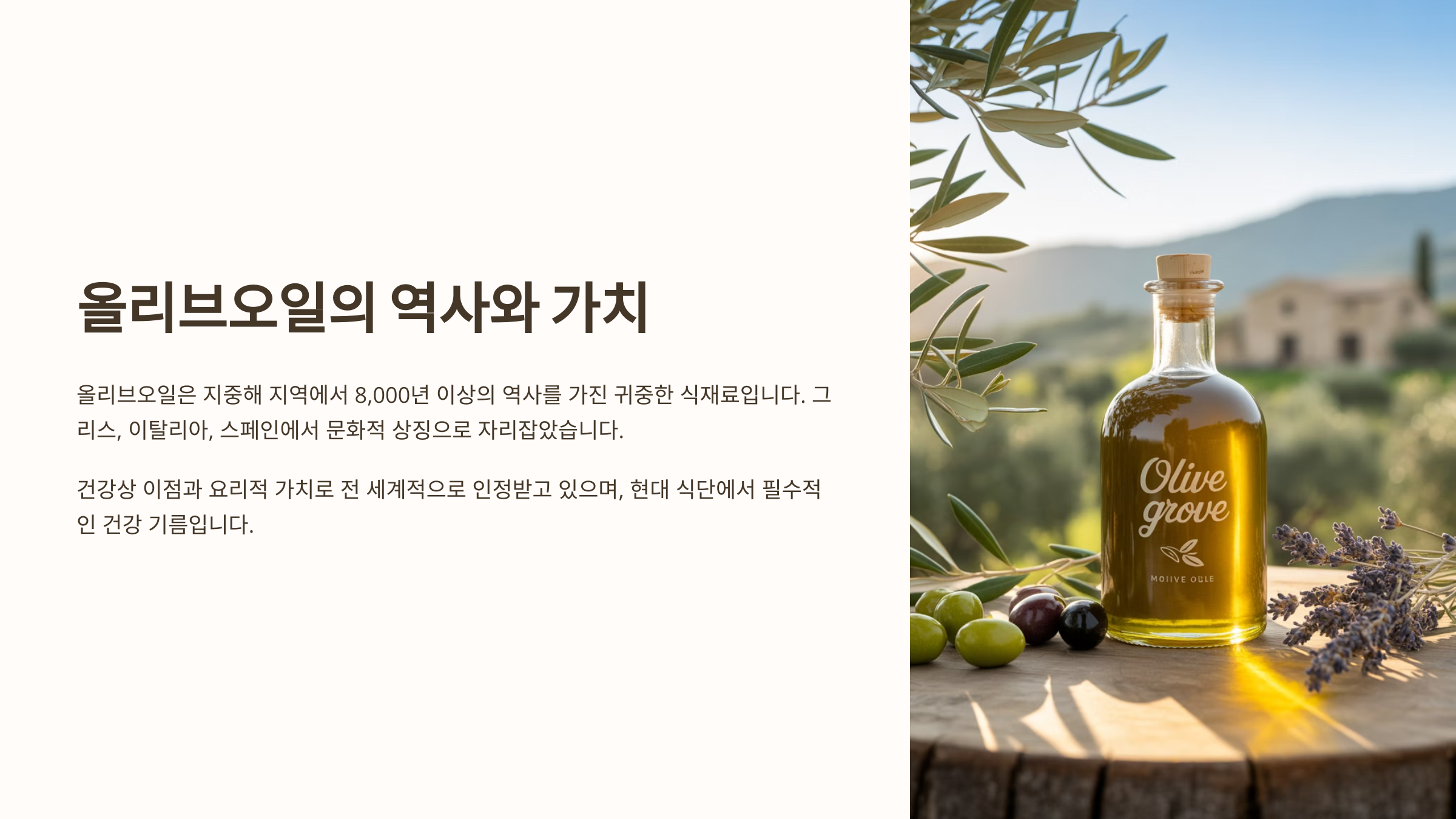이처럼 올리브오일의 기원과 역사를 살펴보면, 단순히 건강에 좋은 기름이 아니라 인류와 함께 걸어온 소중한 동반자라는 걸 알 수 있어요.