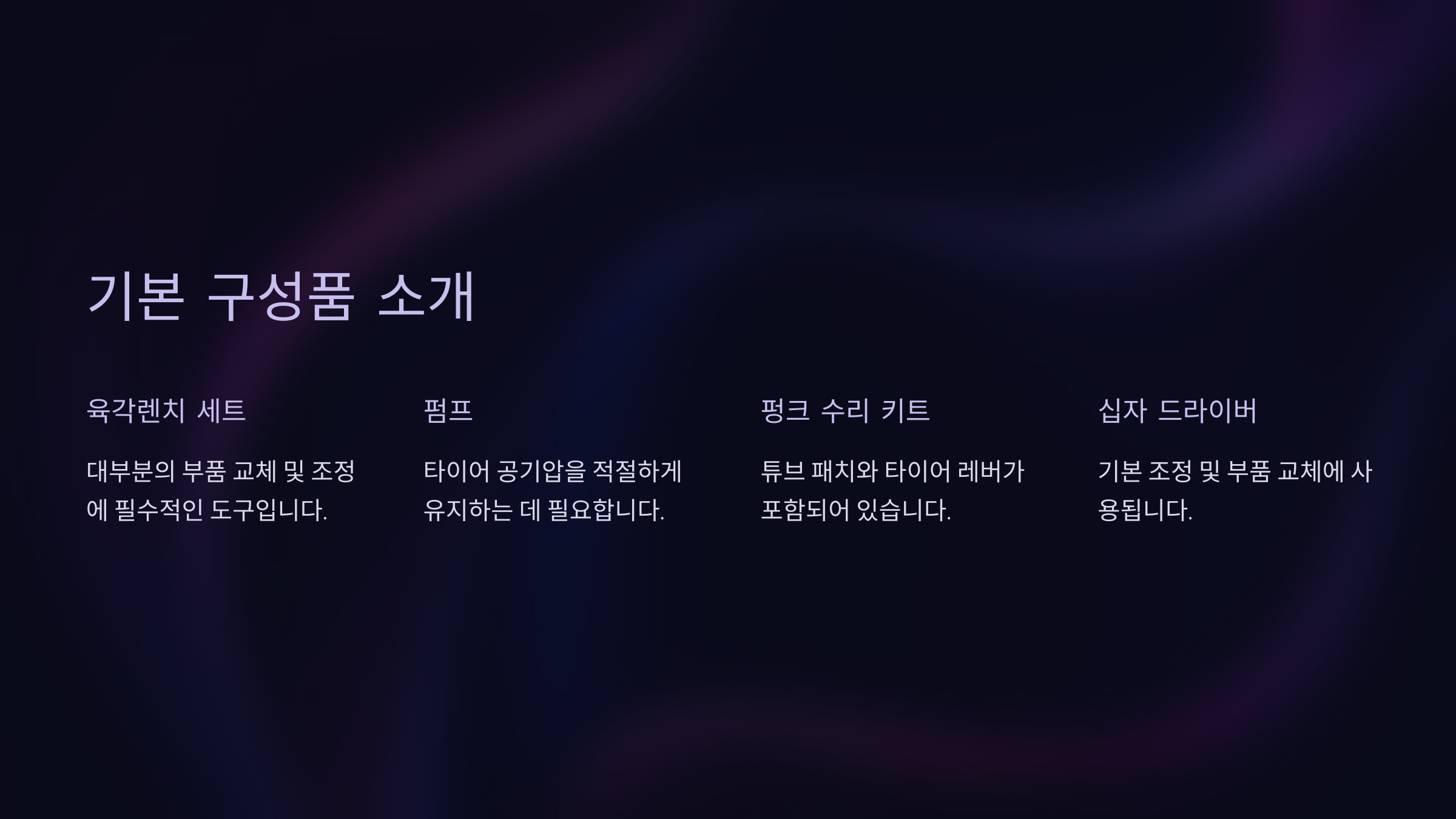 A3. 육각렌치, 체인 툴, 타이어 레버, 펑크 패치 키트, 미니 펌프는 기본으로 갖춰야 해요. 이 다섯 가지는 대부분의 정비 상황에서 사용돼요.