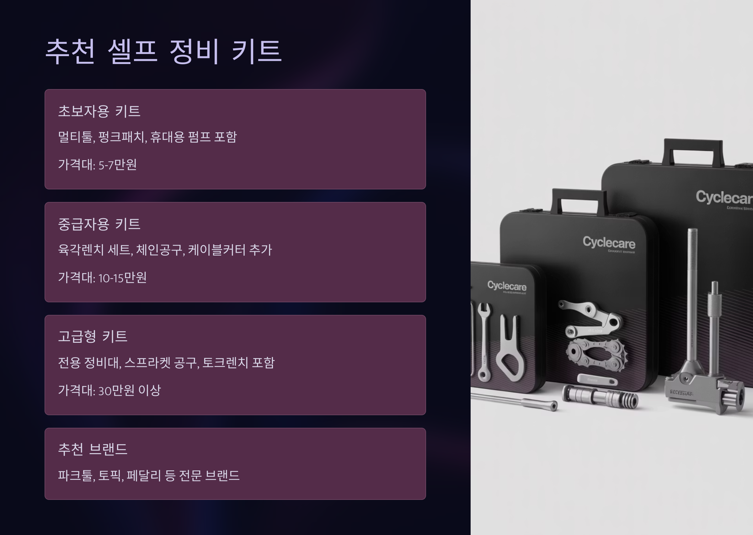 🚴 자전거를 타다 보면 타이어가 펑크 나기도 하고 체인이 빠지기도 하죠. 이럴 때 간단하게 셀프로 고칠 수 있다면 얼마나 든든할까요? 자전거 셀프 정비 키트는 초보자부터 매니아까지 꼭 갖춰야 할 필수 아이템이에요.