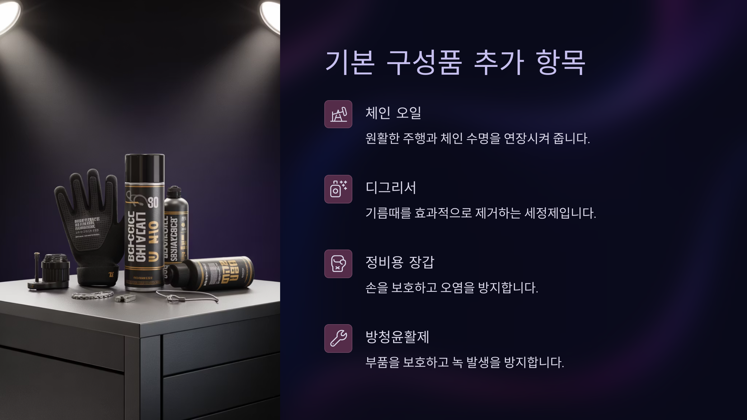 두 번째는 ‘윤활은 정비의 시작’이라는 점이에요. 체인에 주기적으로 윤활제를 발라주면 소리도 줄고, 마모도 방지돼요. 청소 후에는 꼭 윤활을 해줘야 효과가 극대화돼요. 너무 많이 뿌리는 것보단 적당히 얇게 바르는 게 핵심이랍니다.