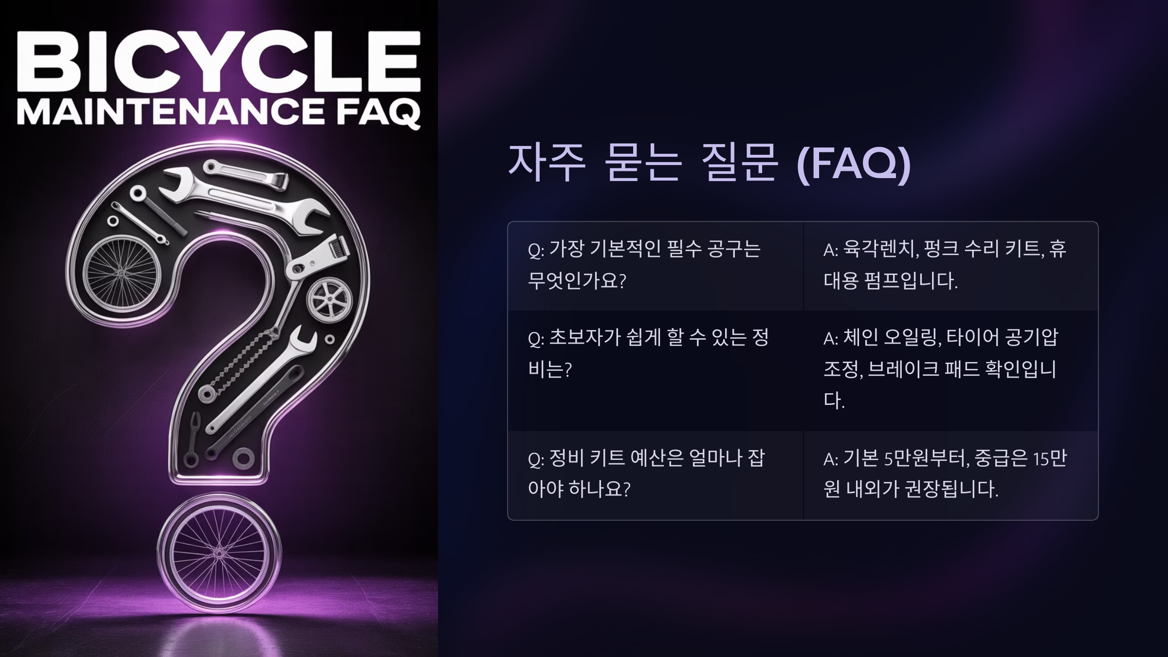Q1. 자전거 셀프 정비 키트를 어디서 구매할 수 있나요?A1. 온라인 쇼핑몰(쿠팡, 네이버 스마트스토어, 11번가 등)이나 자전거 전문 매장에서 쉽게 구매할 수 있어요. 제품 후기를 꼭 확인해보고 선택하세요!