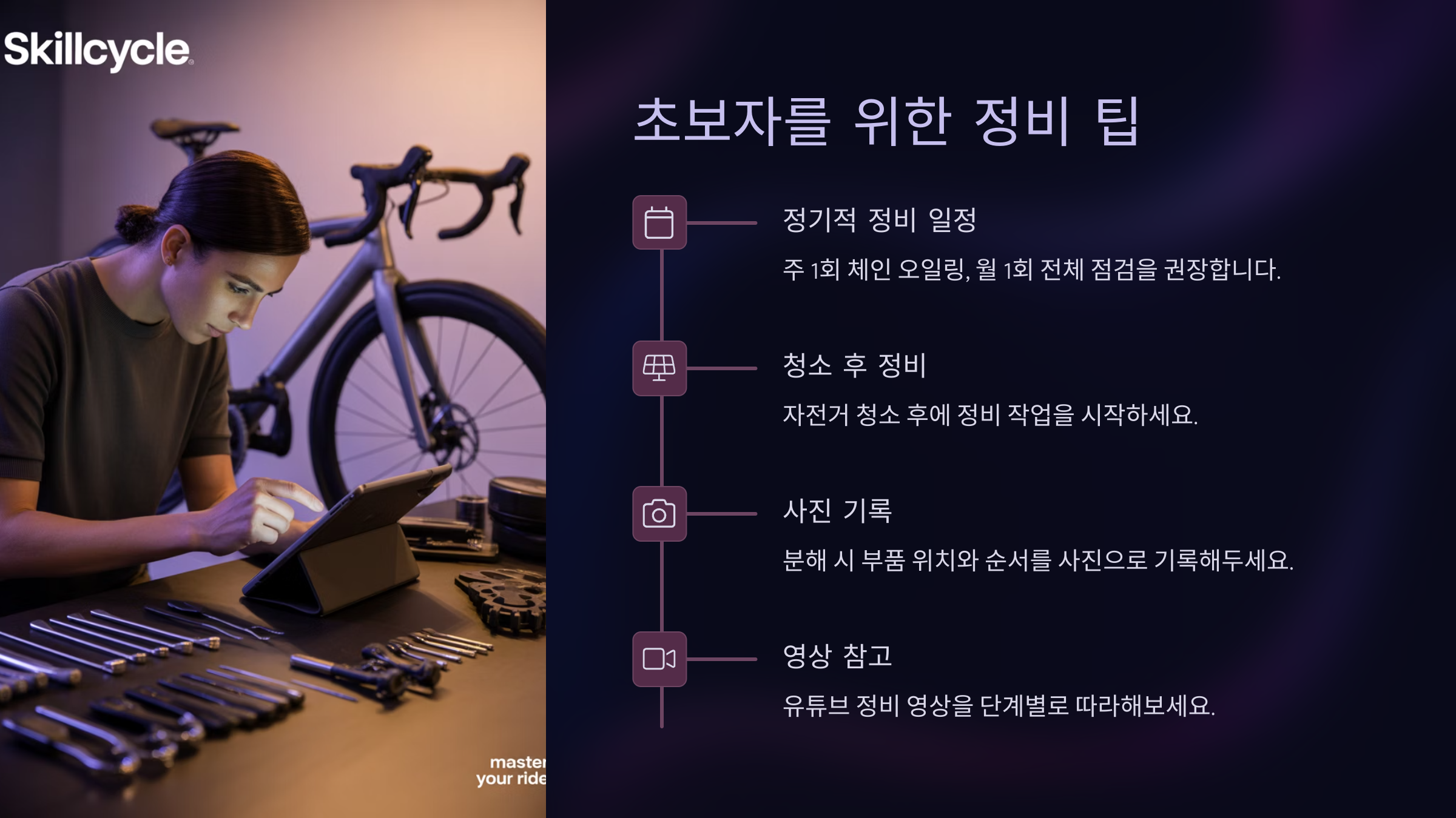 자전거 정비는 처음엔 어렵게 느껴질 수 있지만, 몇 가지 팁만 알면 누구나 쉽게 시작할 수 있어요. 특히 처음 자전거를 접하거나 정비에 익숙하지 않은 분들은 기본부터 차근차근 익히는 게 좋아요.첫 번째 팁은 ‘기본 점검 루틴 만들기’예요. 자전거를 타기 전 항상 타이어 공기, 브레이크 작동, 체인 상태를 체크해보세요. 이 습관만으로도 큰 고장을 미리 예방할 수 있어요.