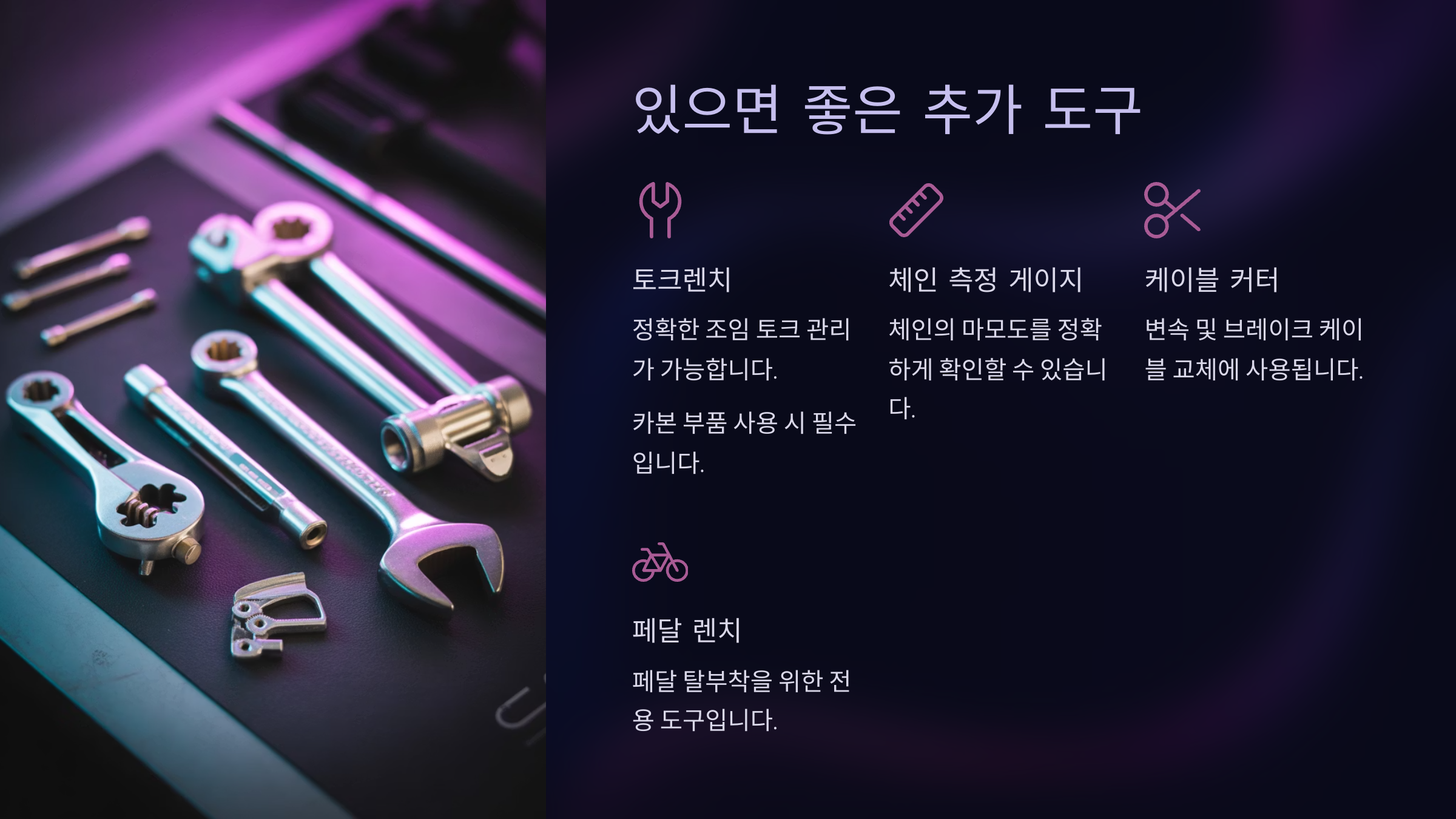 도구명 용도 추천 이유 체인 청소기 체인 내부 세척 빠르고 깔끔함 정비 스탠드 자전거 고정 정비 시 편리함 토크 렌치 정확한 볼트 조임 부품 보호 가능 이 도구들은 정비를 더 정밀하게 하고 싶은 분에게 딱이에요. 자전거가 소중한 만큼, 정비에도 정성을 들이는 모습 멋지지 않나요? 🧽
