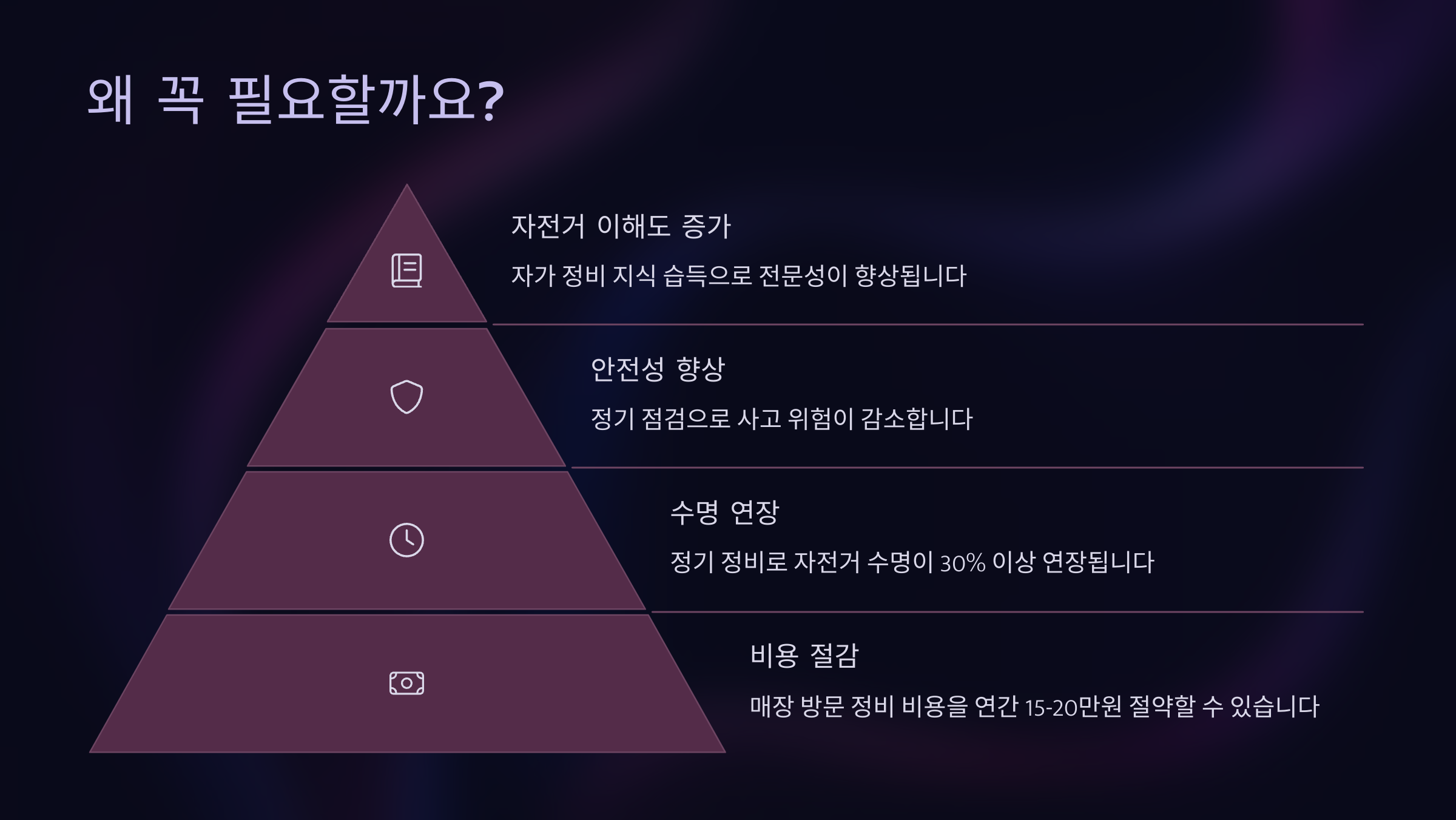 무엇보다 중요한 건 안전이에요. 브레이크, 타이어, 체인 같은 주요 부위의 이상을 스스로 점검하고 빠르게 대응할 수 있다면 사고 위험도 훨씬 줄어들어요. 주기적인 점검을 통해 자전거 수명도 늘어나죠.
