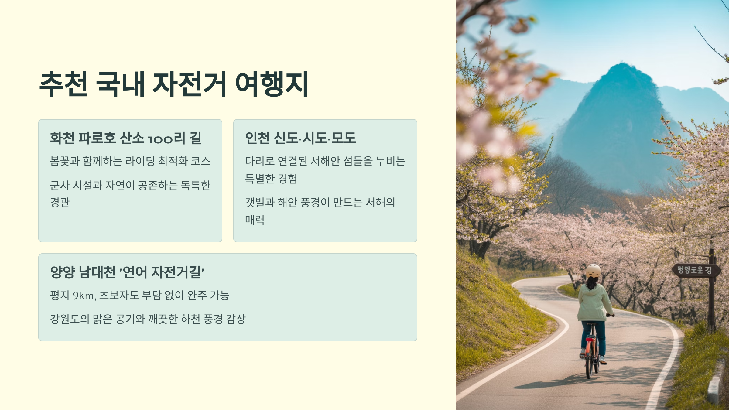 Q1. 자전거 여행을 처음 하는데 어떤 코스가 좋을까요?A1. 초보자라면 서울 한강 자전거길이나 강촌~남이섬 코스처럼 평탄하고 짧은 구간부터 시작해보는 게 좋아요. 안전하고 풍경도 좋아서 입문자에게 추천해요!