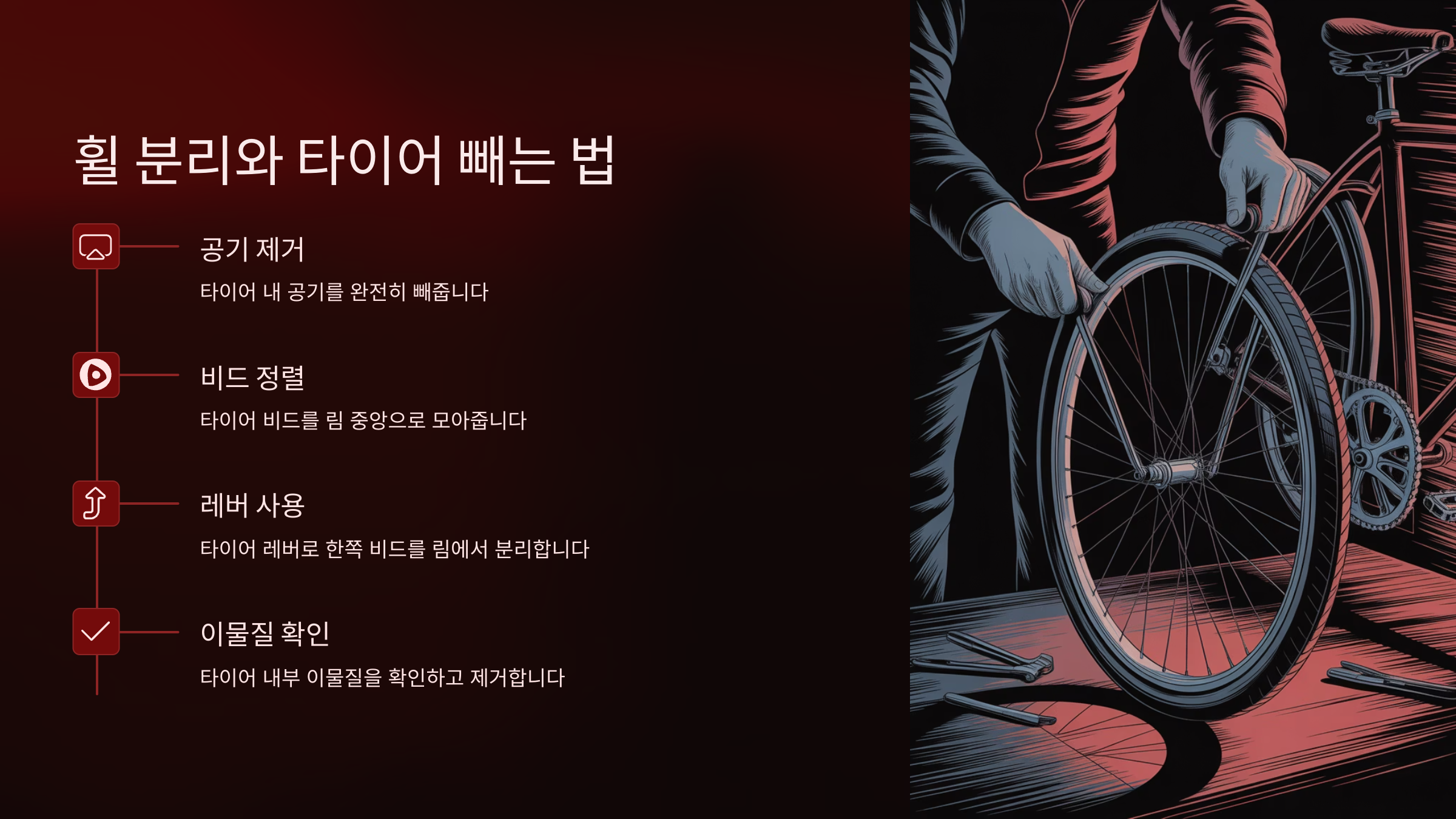 튜브가 림과 타이어 사이에 끼지 않도록 매 단계마다 눌러보고 손으로 만져보는 습관이 필요해요. 특히 마지막 타이어 비드를 넣을 때는 가장 많은 실수가 발생해요. 여기서 튜브를 찝으면, 바람을 넣자마자 터질 수 있어요.