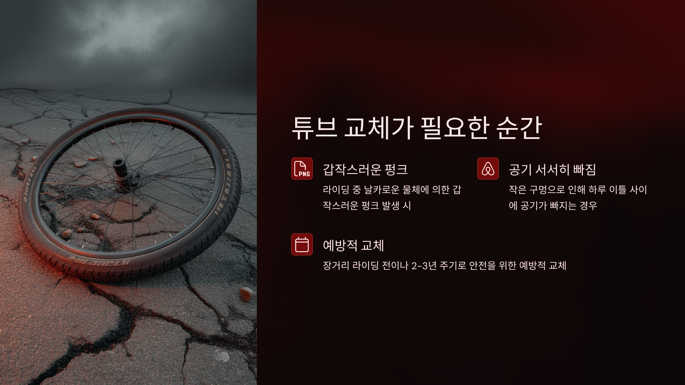 A8. 보통 1~2년에 한 번 교체하거나, 펑크 발생 시 바로 바꾸는 걸 추천해요. 고무는 시간이 지나며 자연 열화가 생기거든요.