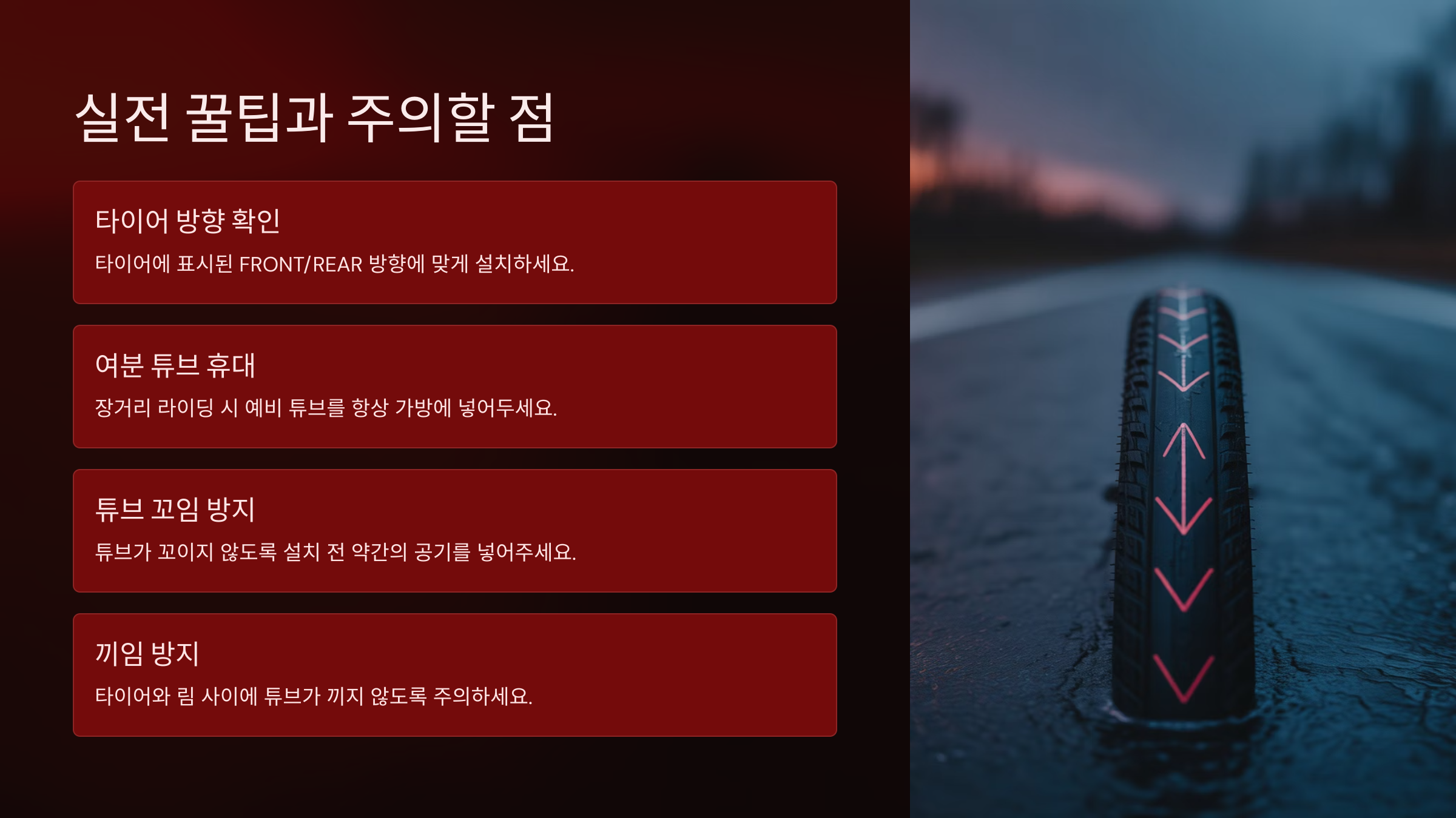 실전 꿀팁과 주의할 점 튜브를 교체할 땐 급하게 하지 말고 차분하게 진행하는 게 좋아요. 튜브를 새로 꺼냈을 때 먼지가 묻지 않게 하고, 타이어 안에 잘 퍼지게 넣는 것도 중요한 포인트예요.