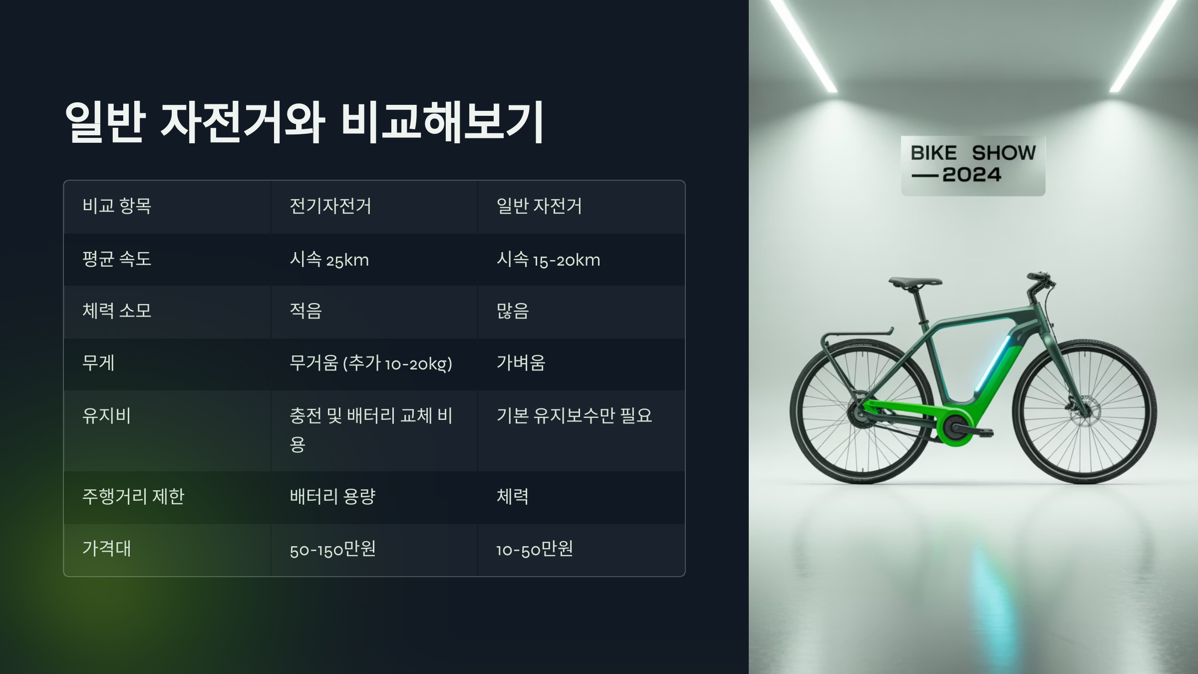 비교 항목 전기자전거 일반 자전거 주행 방식 전기 + 페달 100% 페달 체력 소모 낮음 높음 유지비 충전/배터리 있음 거의 없음 무게 무거움 가벼움 속도/편의성 높음 보통 결론적으로, 이동의 편의성과 시간을 아끼고 싶은 분들에게는 전기자전거가 최고의 선택이에요. 반면 운동 목적이나 간편한 이용을 원한다면 일반 자전거도 여전히 훌륭하죠. 자신이 어떤 상황에서 어떤 목적으로 타는지를 먼저 생각해보면 정답이 보일 거예요. 😊