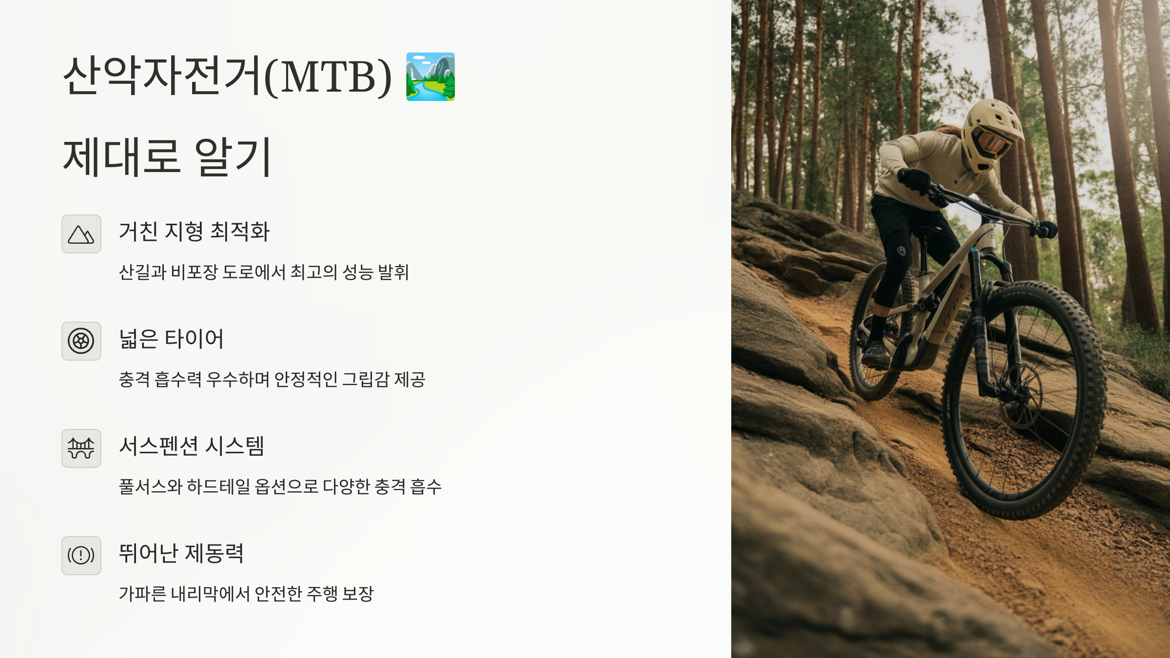 MTB는 단순한 자전거가 아니라 모험 그 자체예요. 야외에서 도전하는 걸 좋아하는 사람이라면 이보다 더 어울리는 자전거는 없을 거예요!