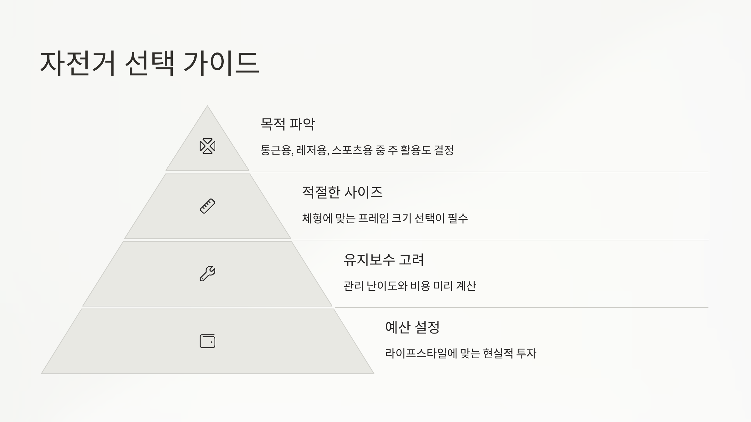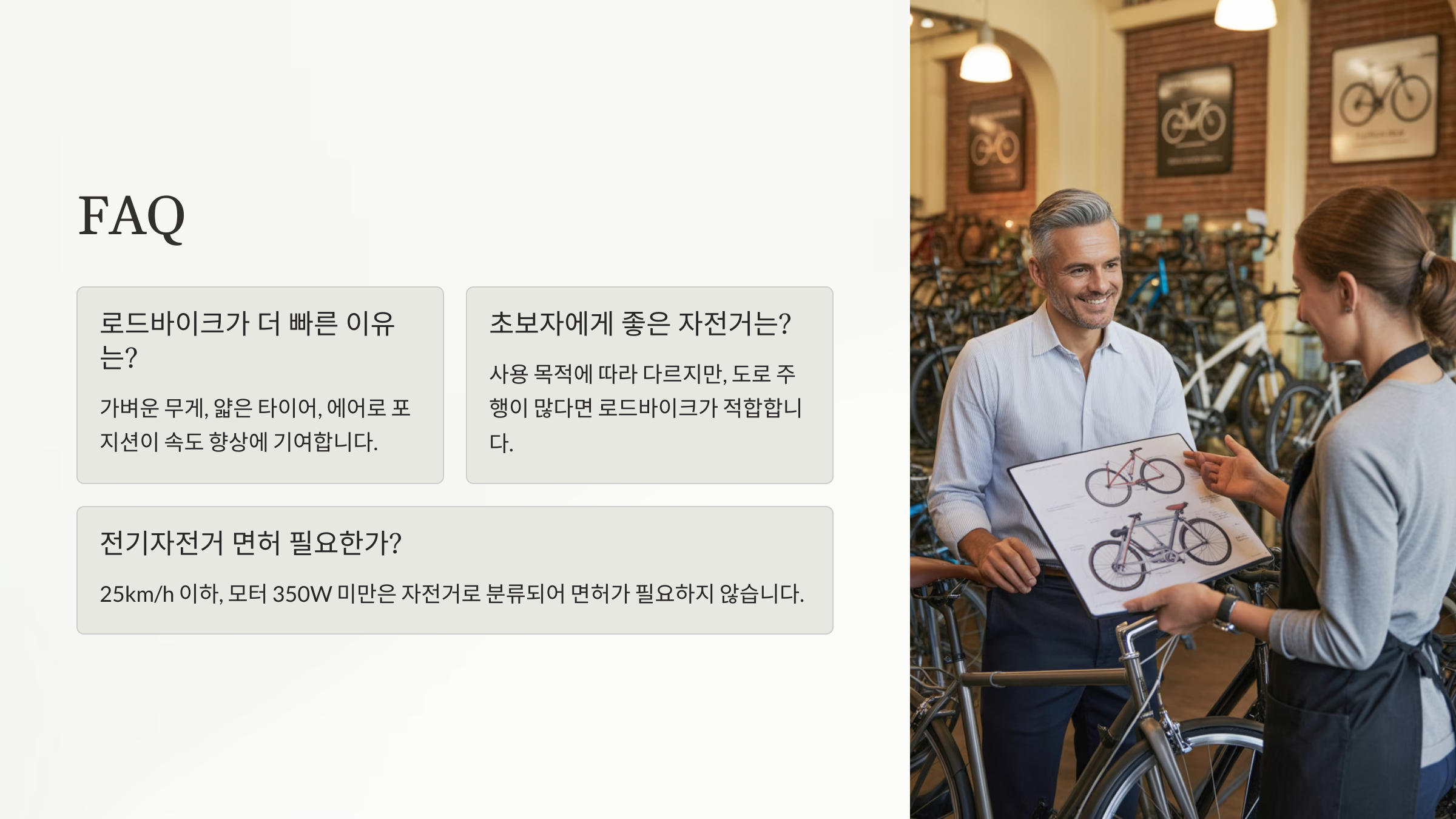 A8. 사용 목적과 주행 환경이에요. 용도에 따라 자전거의 종류와 스펙이 완전히 달라져요.