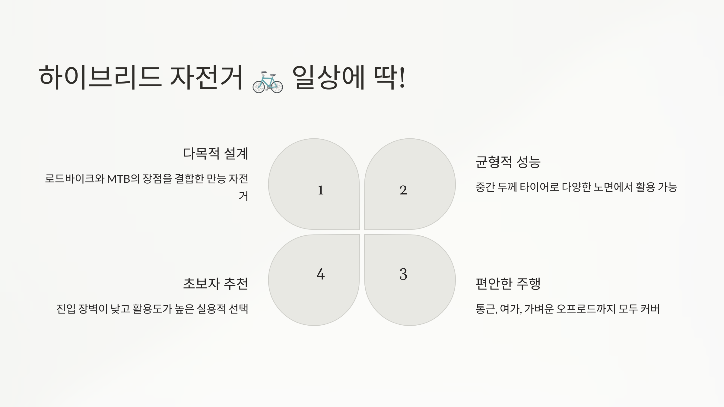 항목 설명 프레임 가벼우면서도 튼튼함 포지션 허리를 곧게 세울 수 있어 편안함 타이어 중간 굵기로 다양한 지형에 적합 속도 빠르진 않지만 꾸준히 주행 가능 특별한 기술 없이도 쉽게 탈 수 있는 하이브리드 자전거는 누구에게나 열려 있는 자전거예요. 특히 자전거를 오랫동안 안 타본 분들에게 강력히 추천해요.