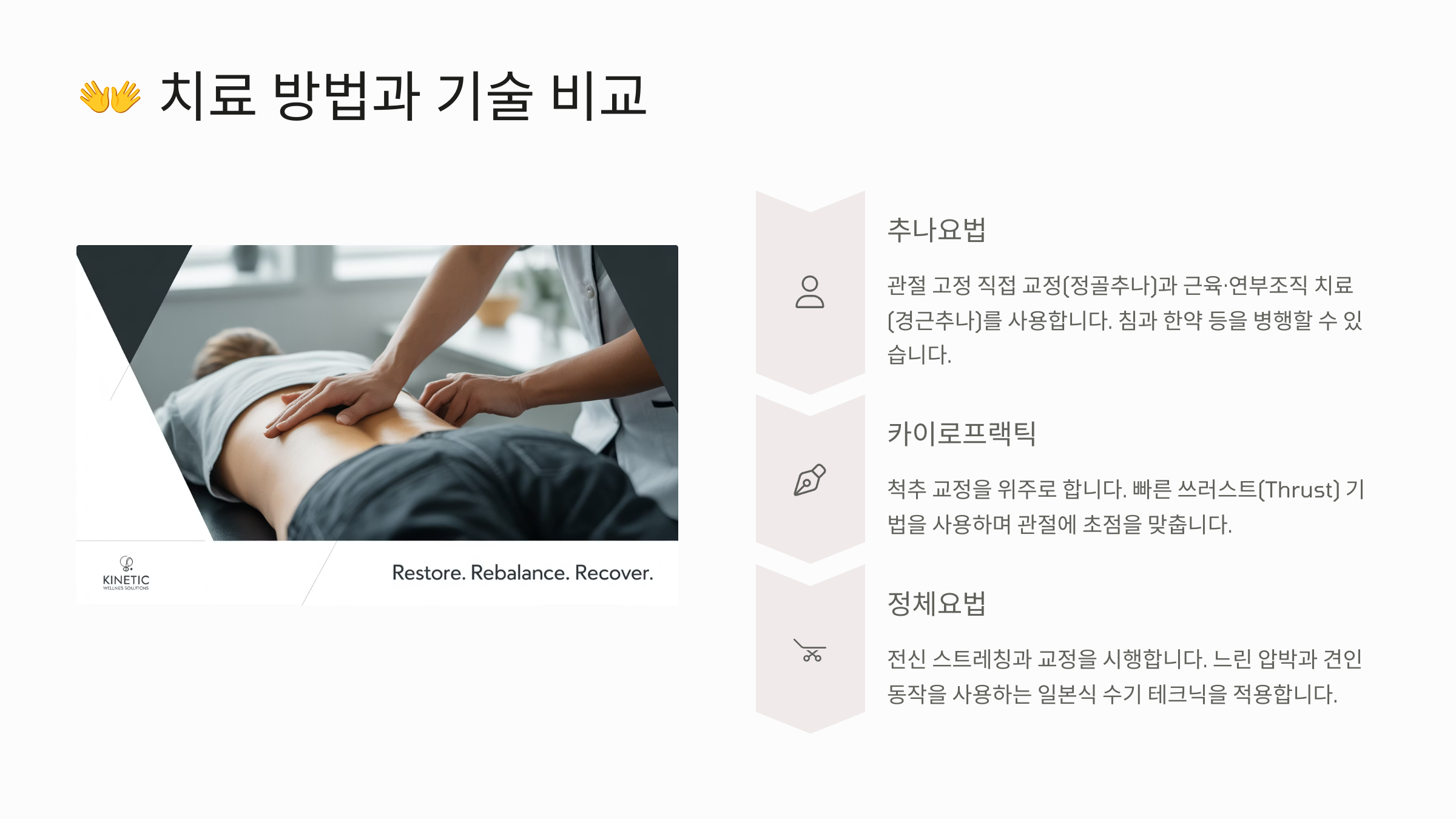 카이로프랙틱은 '툭!'이라는 소리가 매력이라면, 추나요법은 '시원하게 눌러주는 느낌', 정체요법은 '정리정돈 받는 느낌'이라고 표현할 수 있어요. 각 요법이 주는 촉감과 압력, 조작 방법이 전부 다르기 때문에 경험도 완전히 달라요!