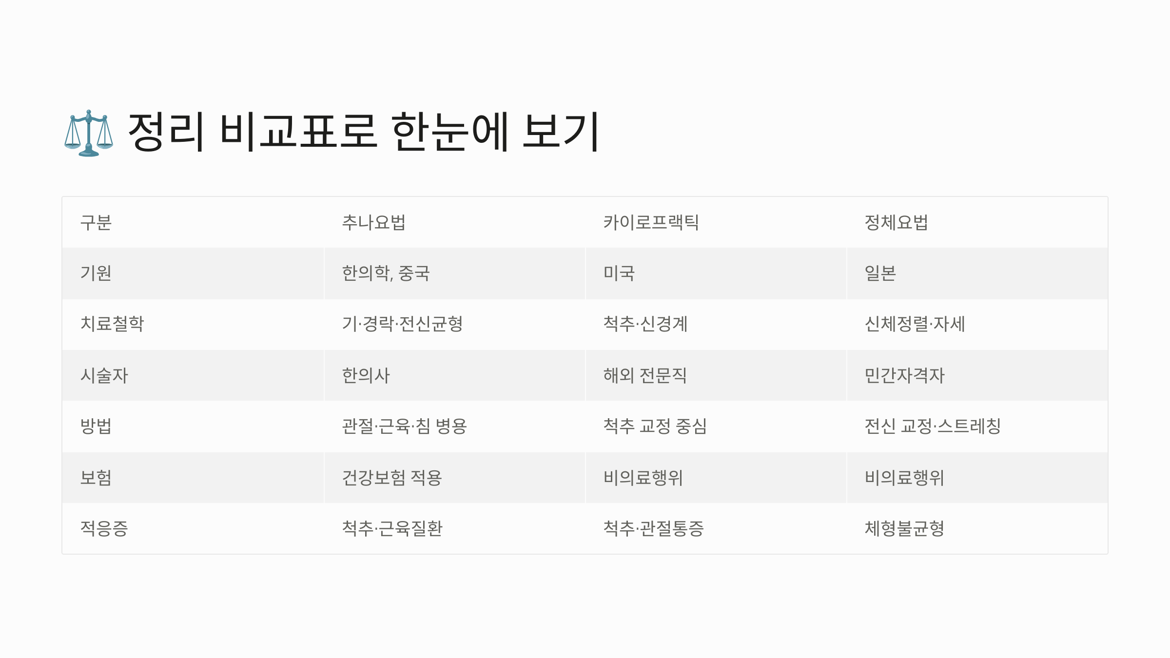 📊 카이로프랙틱·추나요법·정체요법 비교표