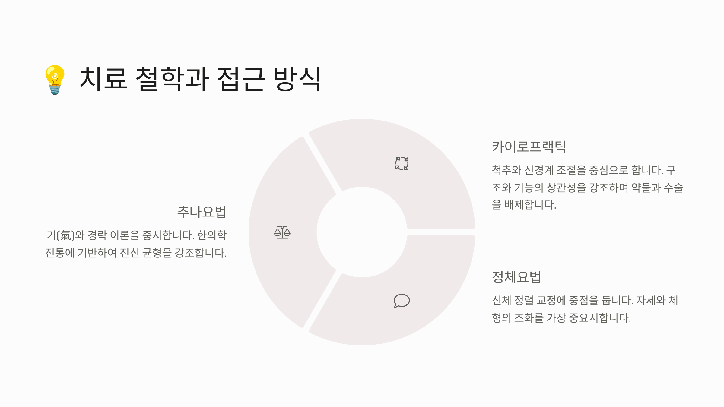 세 가지 요법은 각각 다른 철학을 가지고 있어요. 카이로프랙틱은 '신경계와 척추의 정렬'을 가장 중요한 요소로 보며, 척추의 작은 어긋남(서브럭세이션)이 건강 문제의 근원이라 생각해요. 그래서 척추를 조정하면 신경 전달이 원활해지고 전반적인 건강이 회복된다는 논리를 따르죠.