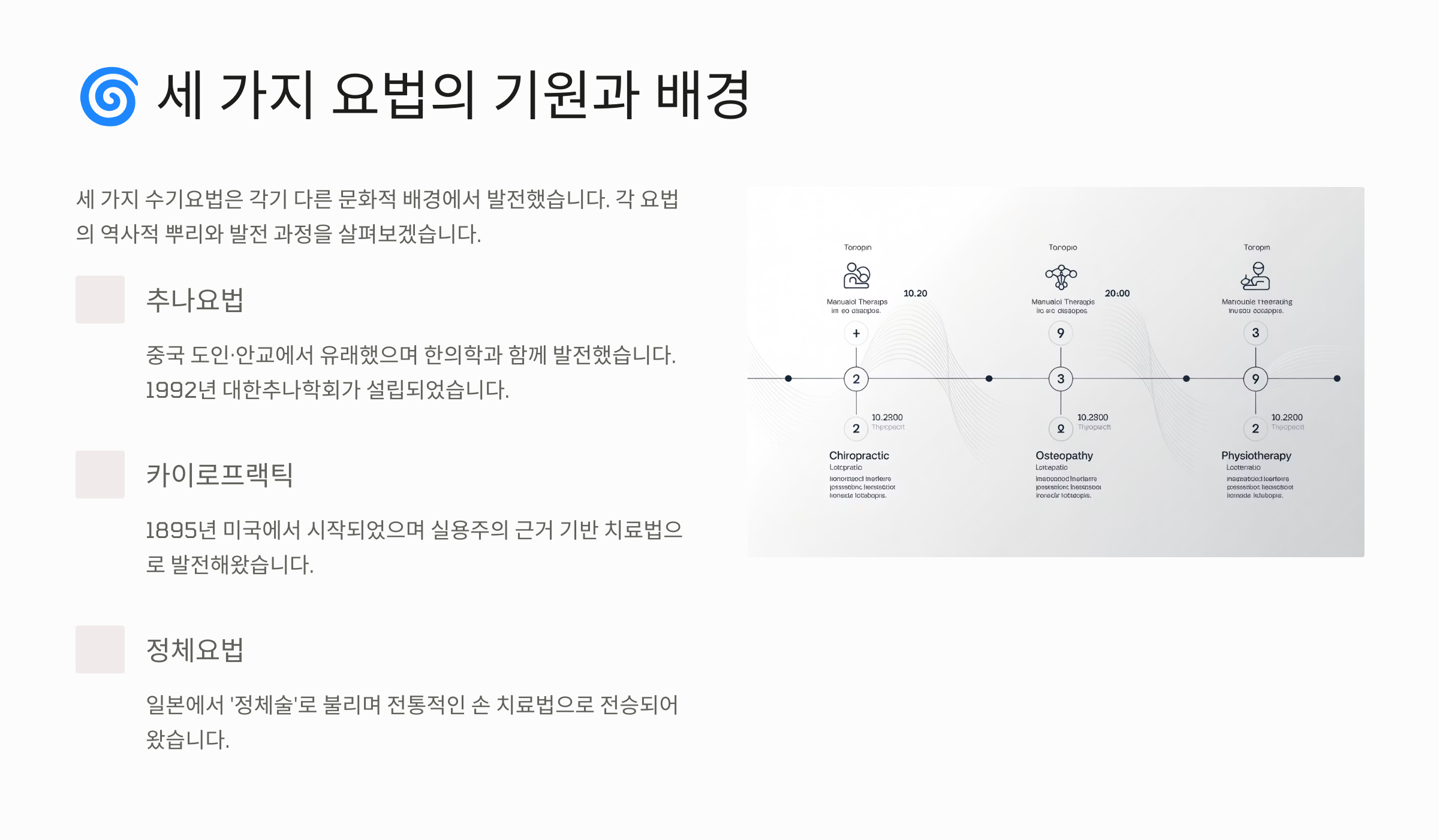 요법명 기원 국가 시작 시기 대표 특징 카이로프랙틱 미국 1895년 척추신경계 중심 추나요법 중국·한국 수천 년 전 한의학 원리 정체요법 일본 20세기 초 복합 수기요법 이처럼 요법마다 역사와 철학이 뚜렷하게 다르기 때문에 단순히 '비슷해 보여서' 선택하기보다는 자신에게 맞는 방식이 어떤 것인지 잘 이해하고 선택하는 게 중요해요.