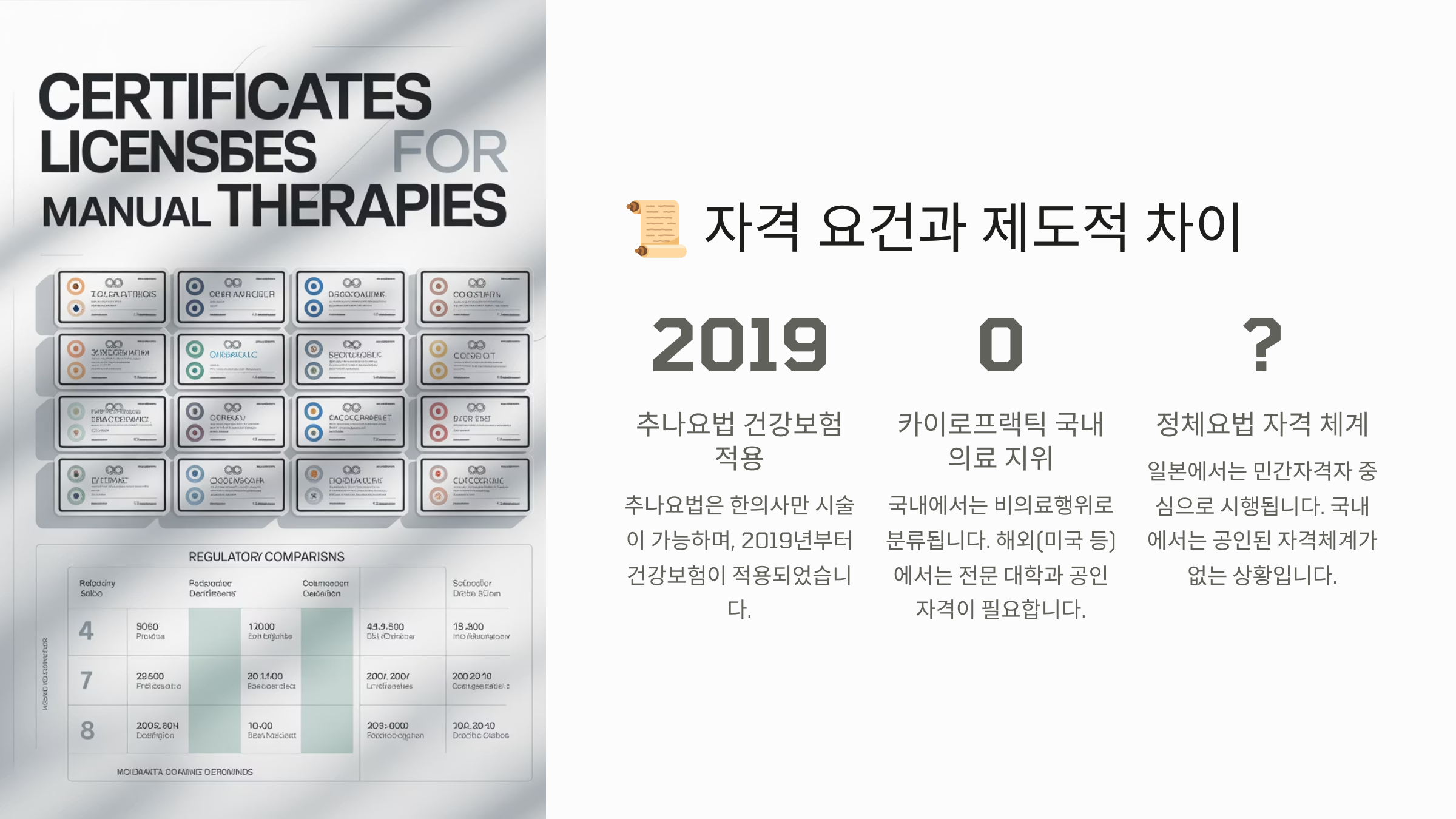 세 가지 요법은 제도적으로도 명확하게 구분돼 있어요. 특히 의료법상 인정되는지, 어떤 전문가가 시술할 수 있는지에 따라 법적 기준이 달라지죠. 먼저 카이로프랙틱은 우리나라에서는 아직 법적으로 명확히 인정받지 못한 분야예요. 외국(미국, 캐나다, 호주 등)에서는 국가 공인 전문의 자격이 있지만, 한국에서는 물리치료사나 대체의학 전문가들이 일부 병원이나 클리닉에서 비공식적으로 시술하고 있어요.