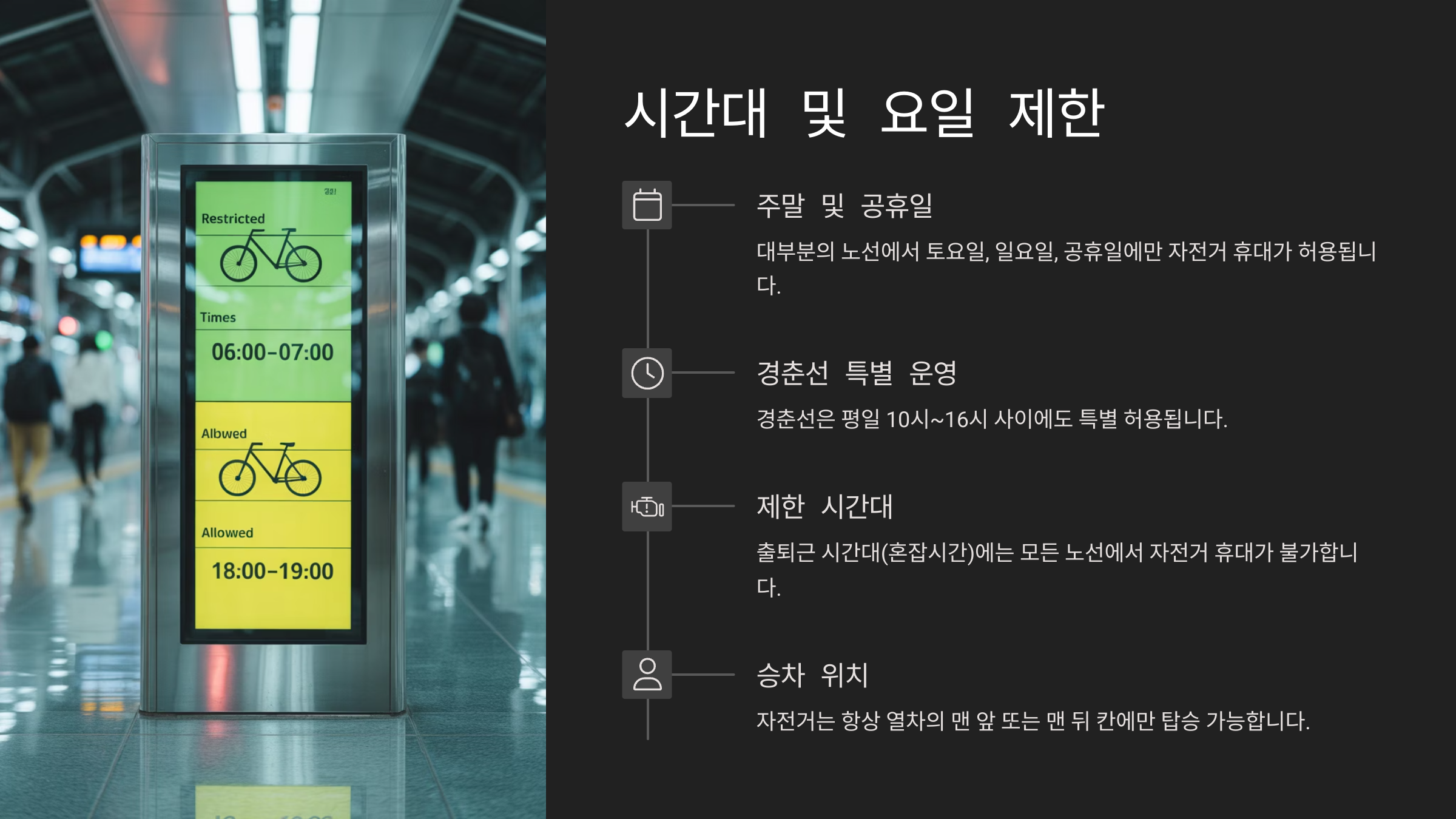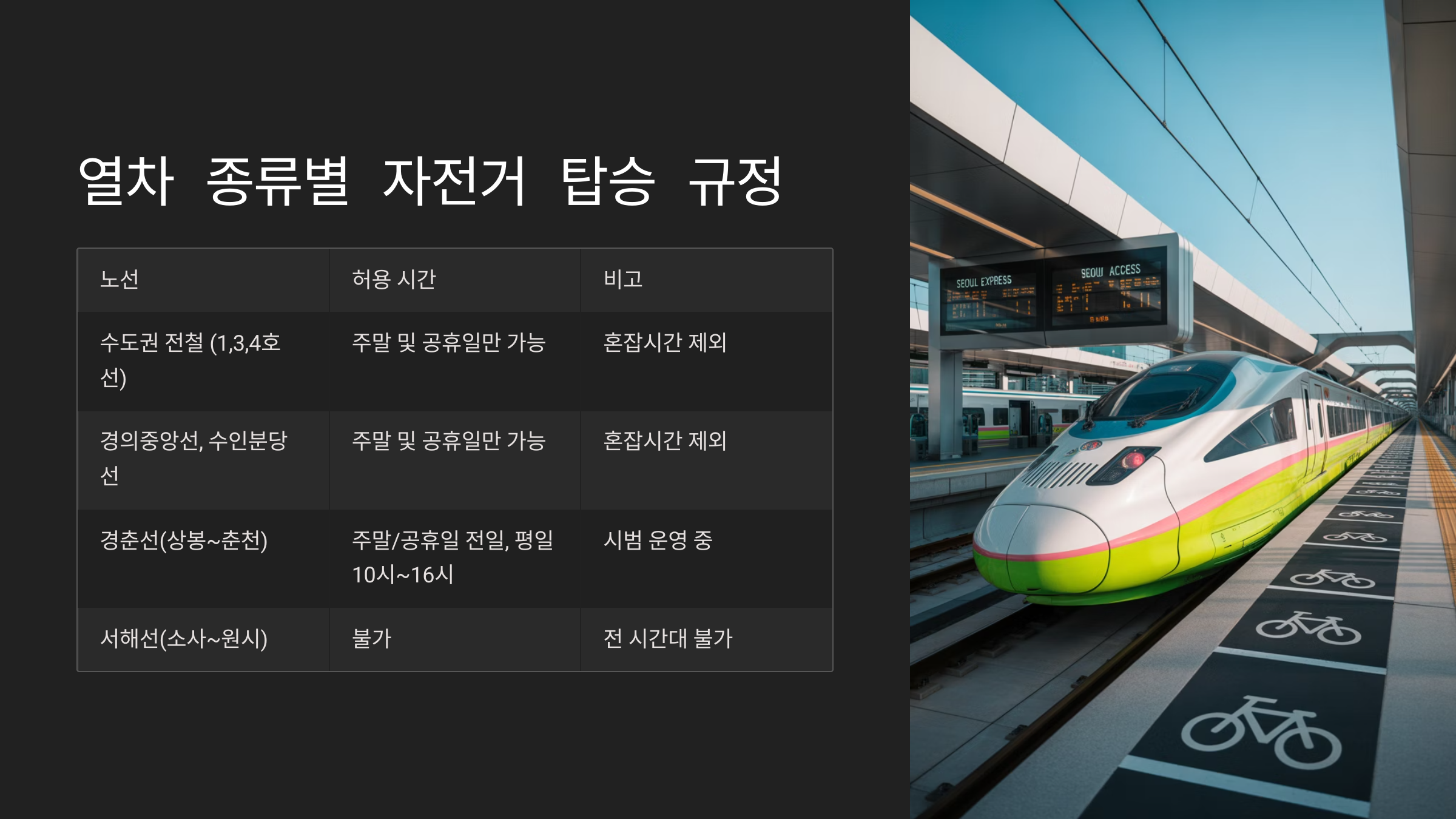 기차에 자전거를 태우는 건 가능하지만, 아무 때나 되는 건 아니에요! 대부분의 열차는 자전거 탑승이 가능한 시간대와 요일을 제한하고 있어서, 무턱대고 자전거를 들고 역에 갔다간 낭패 보기 딱 좋아요.