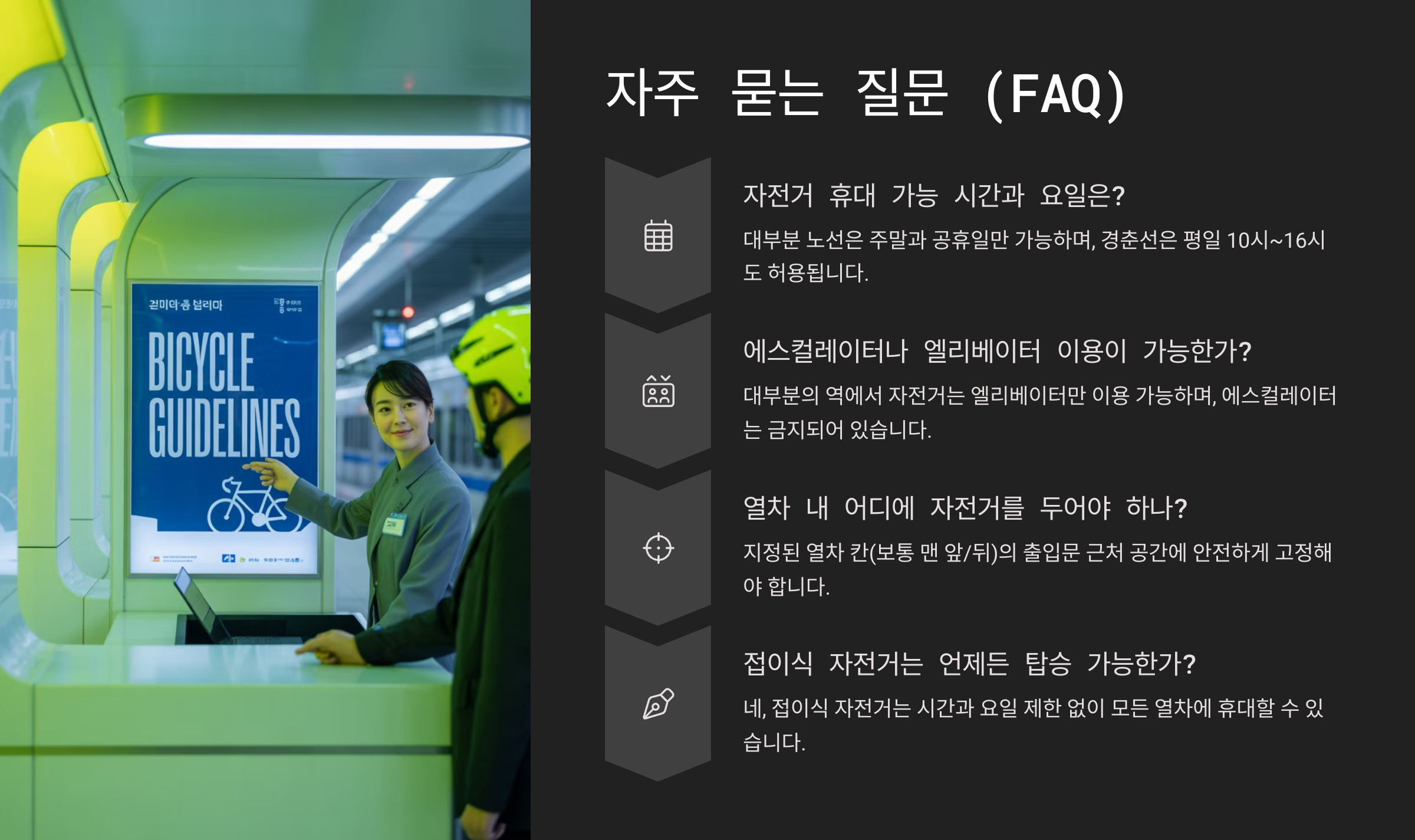 A2. 아니에요. 자전거 거치칸이 있는 특정 열차만 가능해요. 열차번호 확인은 필수예요.