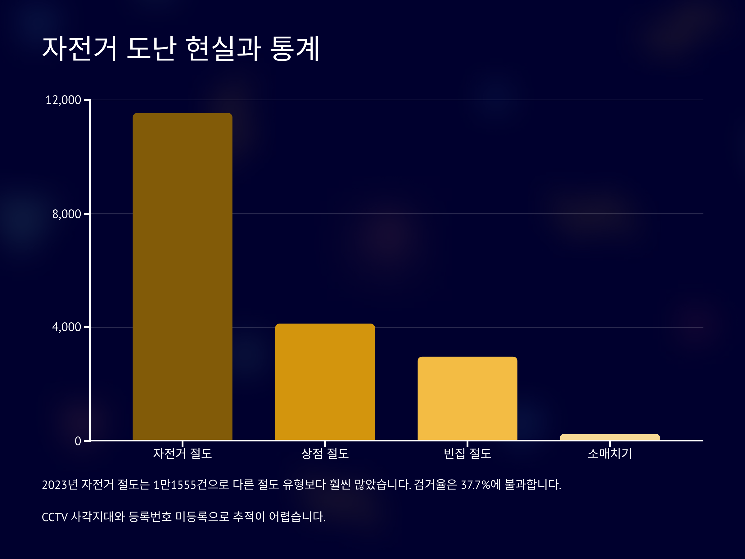 자전거 도난은 생각보다 훨씬 자주 일어나요. 경찰청 자료에 따르면, 국내에서 매년 약 3만 대 이상의 자전거가 도난당하고 있대요. 이 수치는 신고된 것만 기준이라, 실제로는 이보다 훨씬 많을 거예요. 😱도난 장소는 주로 아파트 주차장, 학교, 공원 근처, 지하철역 근처가 많아요. 특히 CCTV 사각지대나 사람들이 많지 않은 야간 시간대가 도난의 위험이 높아요. 도둑들은 몇 초 만에 자물쇠를 절단하고 사라지기도 해요.