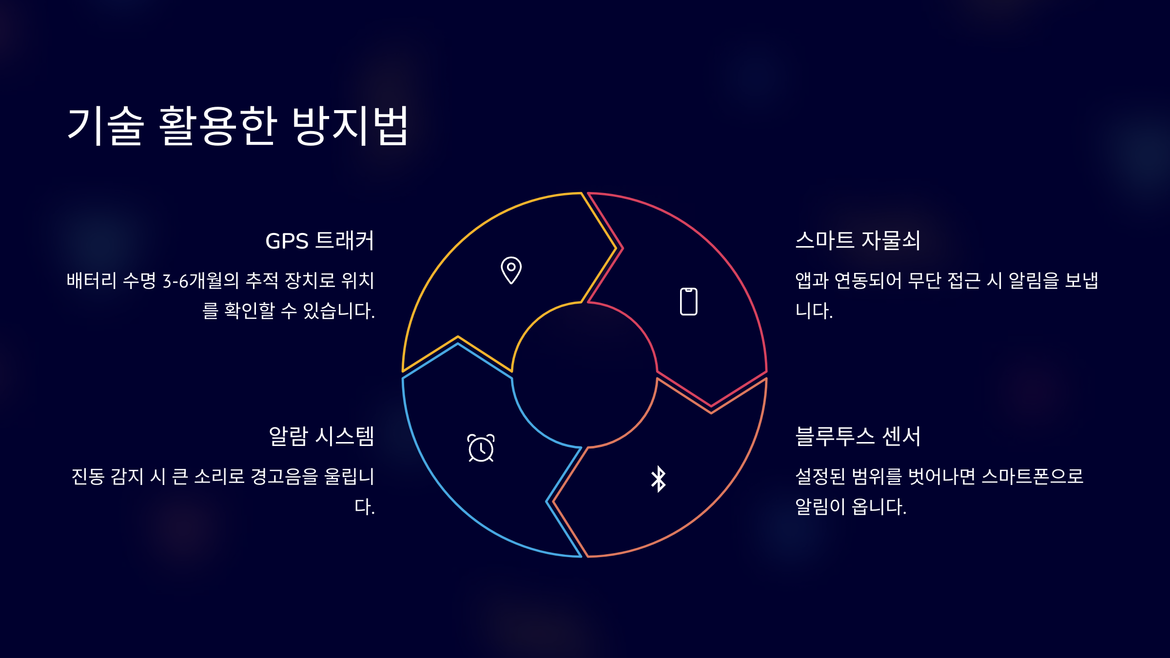 마지막으로는 도난방지 알람이에요. 진동 감지 센서가 달려서 누가 건드리면 즉시 경고음을 울리는 장치예요. 밤에 야외 주차 시 정말 유용하답니다. 🔊