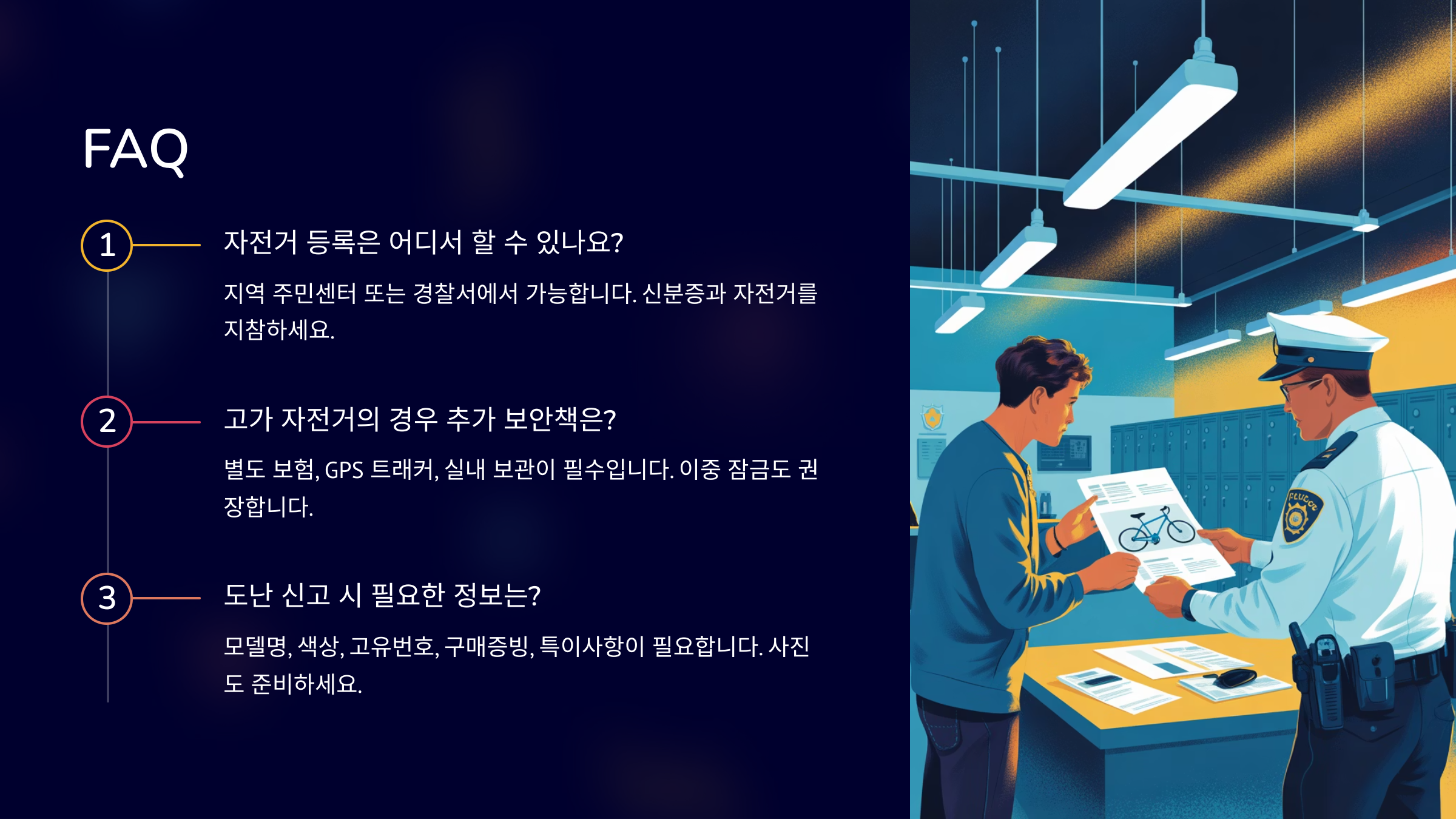 Q1. 자전거 도난 시 경찰에 신고하면 찾을 수 있나요?A1. 신고는 꼭 해야 하지만, 회수율은 낮아요. 프레임 넘버와 사진, 등록제 참여 여부가 있으면 찾을 확률이 올라가요.