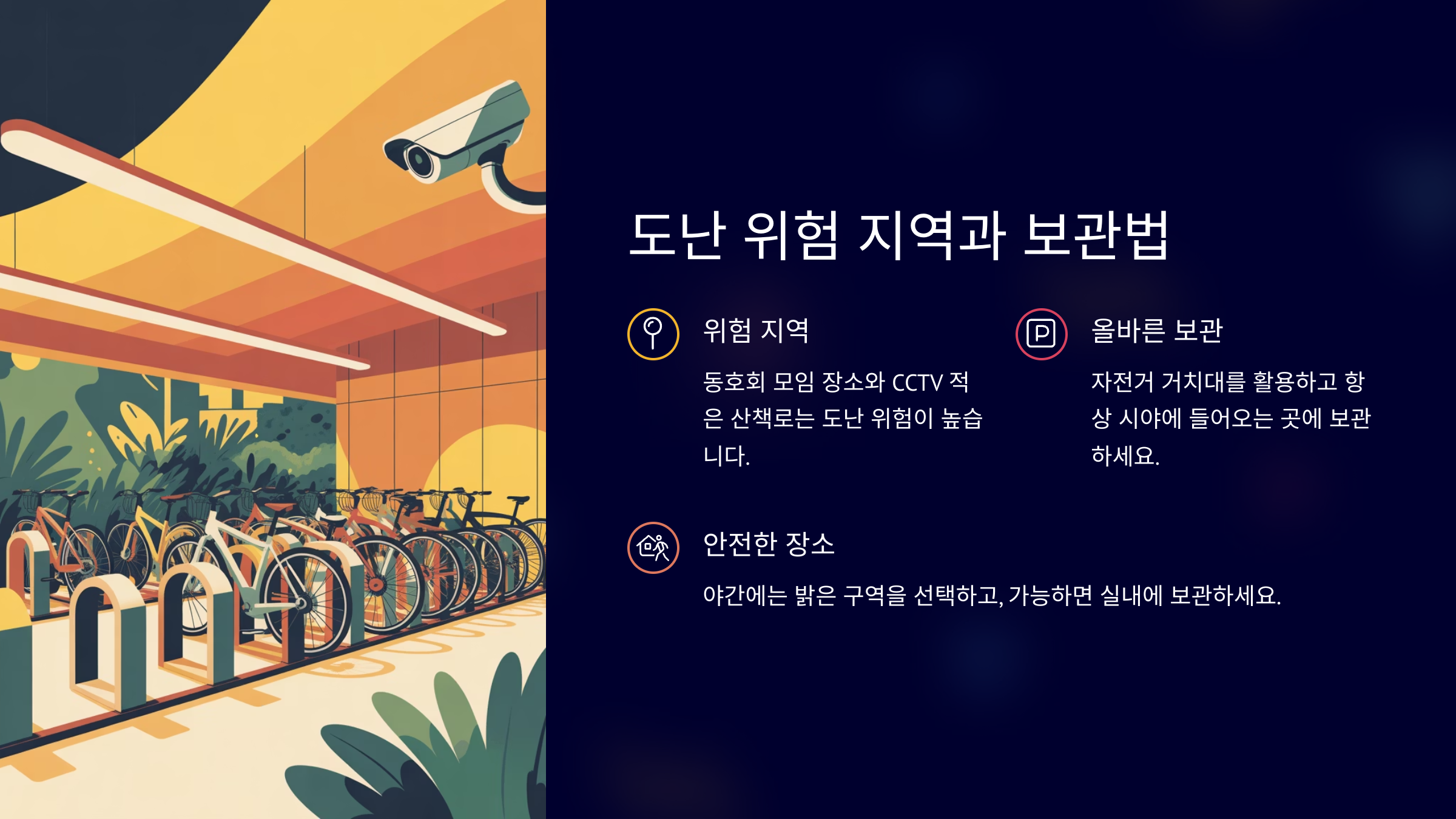구분 위험 지역 안전 지역 조명 어두운 골목 가로등 밝은 곳 CCTV 없는 곳 CCTV 설치된 곳 사람 왕래 드문 후문 출입구 주변 보관 위치 방치된 구석 보관함, 실내 장소를 잘 고르는 것만으로도 도둑은 90% 이상 포기한대요! 장소도 전략적으로 선택해보세요 🧐