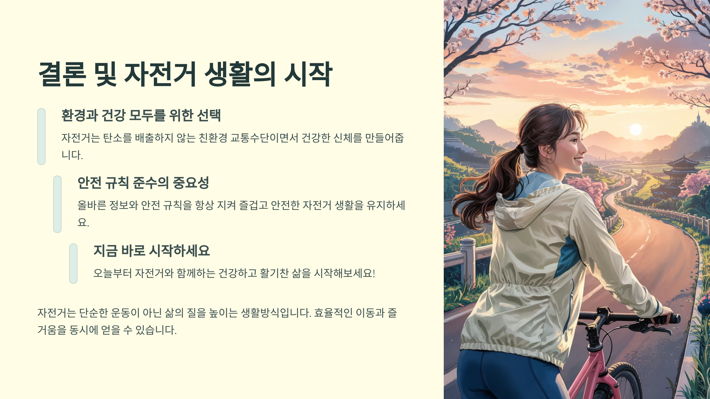우리나라에서도 최근 친환경, 건강 중심의 라이프스타일이 인기를 끌면서 자전거 문화가 점차 확산되고 있어요. 자전거 대여 서비스, 자전거 축제, 자전거 도로 확장 등 변화가 눈에 띄고 있어요. 🚴‍♀