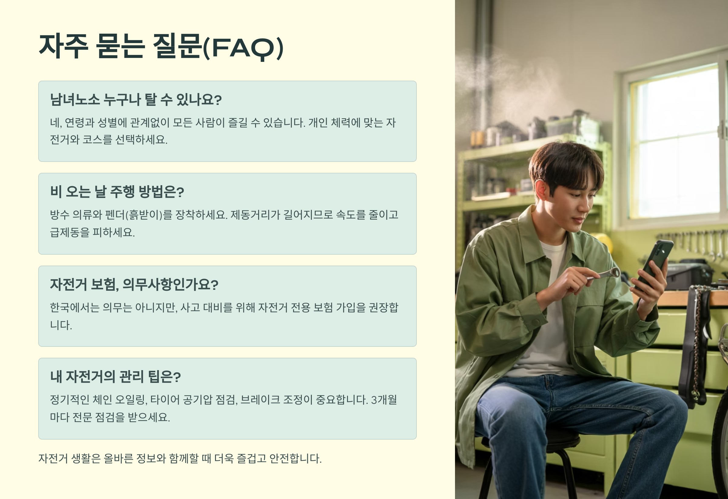 A6. 네, 특히 브레이크, 타이어, 체인은 주기적으로 점검해줘야 안전하게 탈 수 있어요.