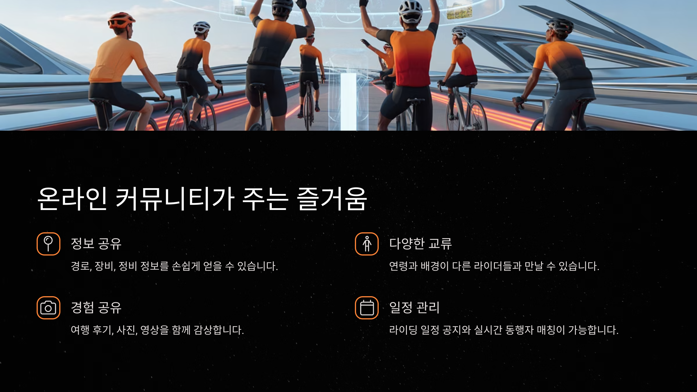 또한 커뮤니티 게시판 중에는 ‘동행 구해요’나 ‘같이 타실 분?’ 같은 코너가 있어요. 주말이나 휴일에 외롭지 않게 함께 라이딩할 친구를 찾을 수 있어요. 오프라인에서 함께 타고 나면 더 친해지고, 서로 응원하는 친구가 되기도 하죠. 어느새 동호회 이상의 가족 같은 사이로 발전하기도 해요.