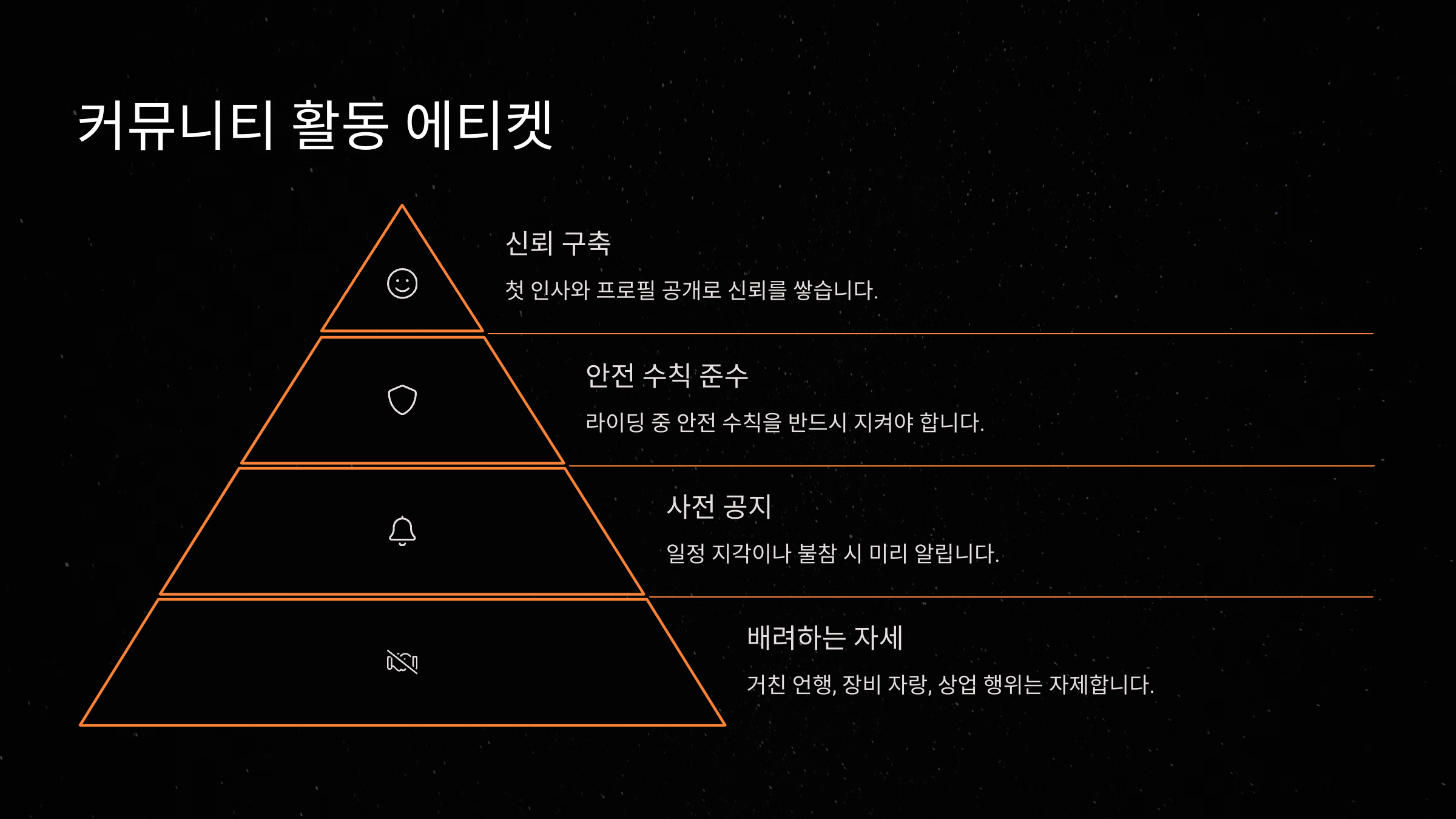 모임에 참여할 땐 ‘존중’과 ‘예의’가 필수예요. 늦지 않게 도착하고, 정해진 코스와 리더의 안내를 따르는 게 기본이에요. 나만의 속도나 스타일을 고집하면 다른 참여자들이 불편해질 수 있어요. 함께하는 라이딩이니까요! 🚴♂
