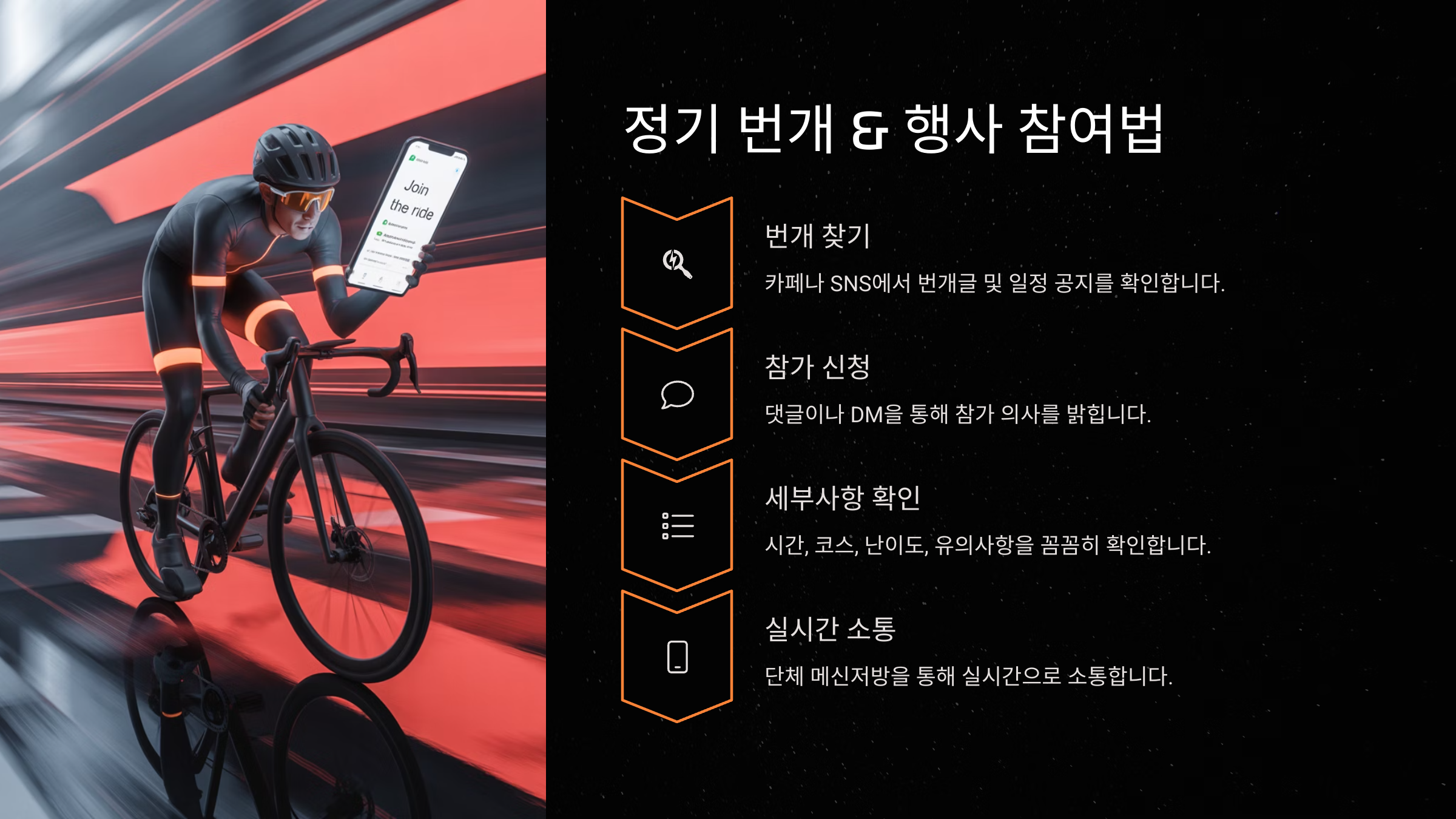 정기 번개 & 행사 참여법 자전거 커뮤니티에서 가장 재미있는 활동 중 하나가 바로 정기 번개와 이벤트예요. '번개'는 즉석에서 잡히는 라이딩 약속이고, '정모'는 정기 모임이에요. 요즘엔 카카오톡 오픈채팅이나 디스코드 서버로 일정 조율도 하고, 모임 참가도 훨씬 쉬워졌어요.
