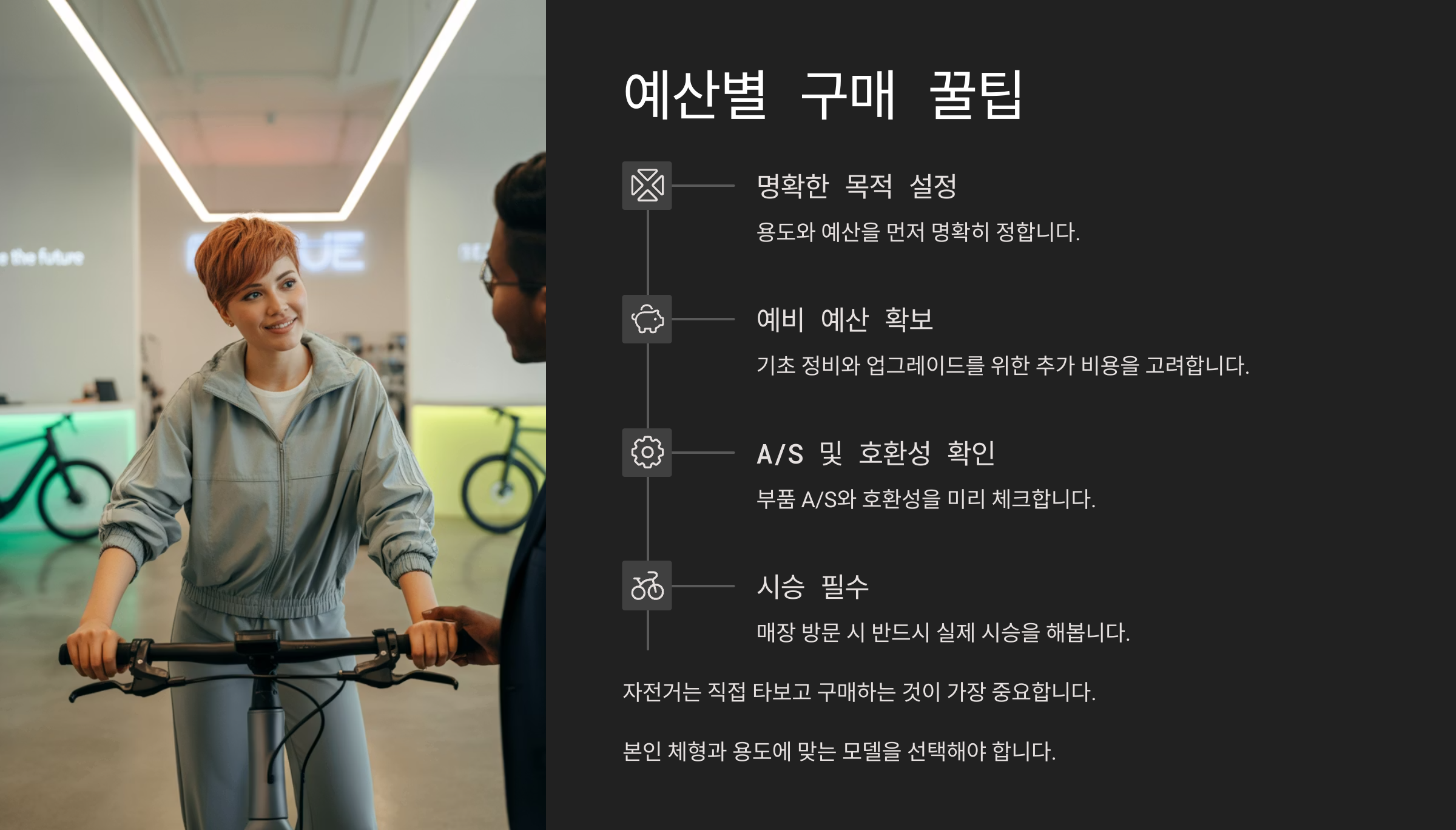 마지막으로는 꼭 매장에서 시승해보고 사는 걸 추천해요. 체형과 맞지 않는 자전거는 금방 흥미를 잃게 하거든요. 가능하다면 안장 높이, 손잡이 거리 등을 직접 느껴보고 결정하세요 🚴♂️