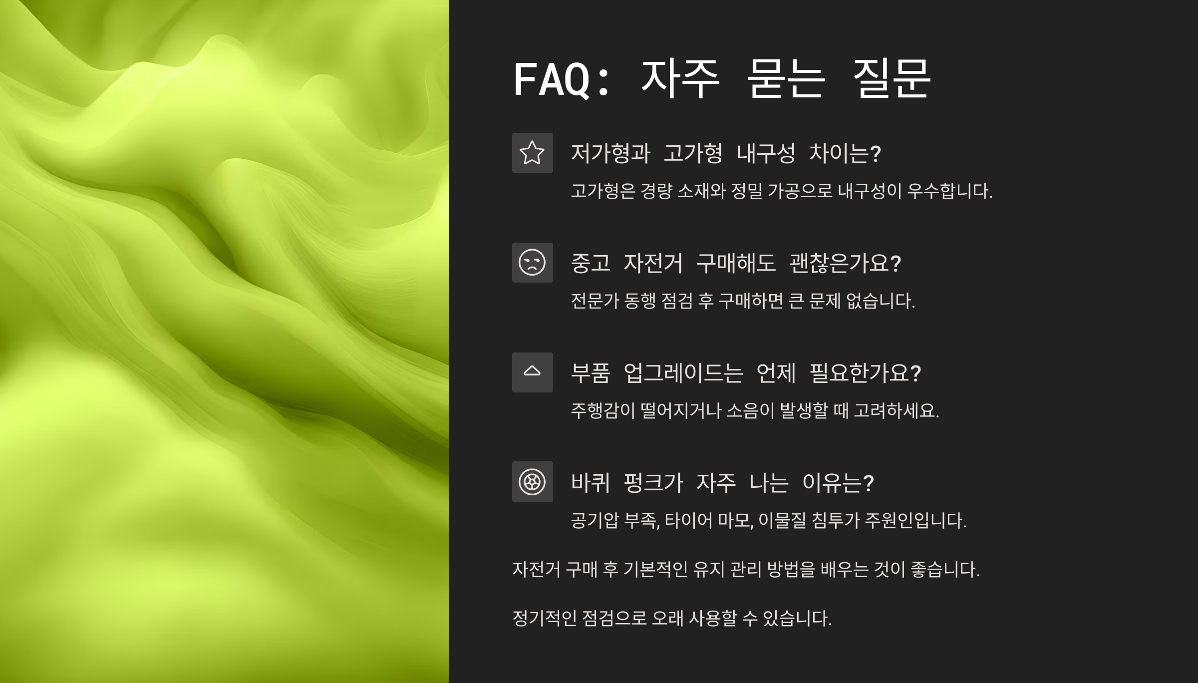 A8. 주기적으로 체인에 윤활유를 바르고 타이어 공기만 체크해도 반은 관리 끝이에요. 처음엔 생소하지만 금방 익숙해져요.