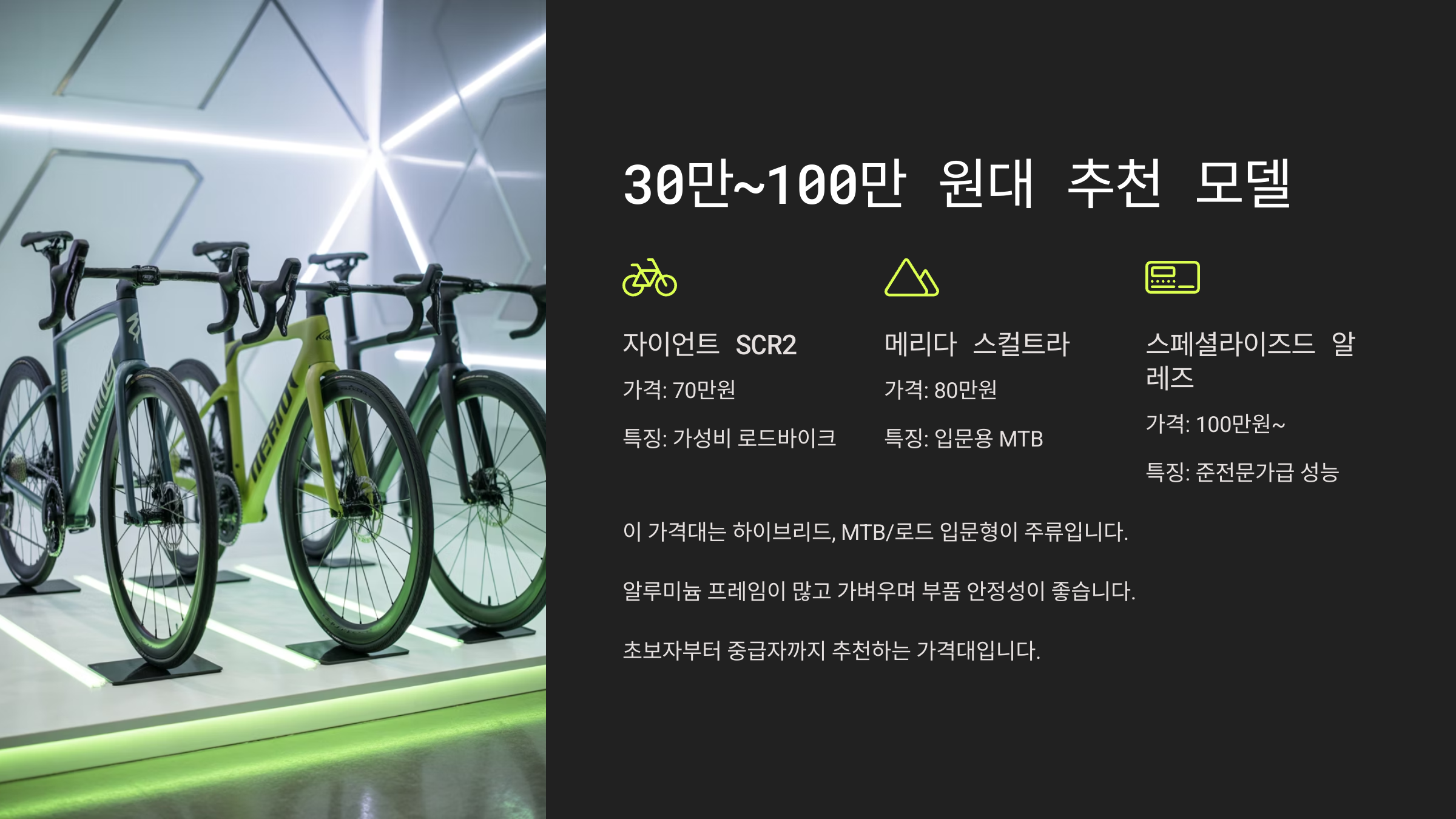 이 구간은 선택지가 폭넓고, 성능과 디자인을 모두 잡은 모델이 많아요. 입문자와 중급자 모두 만족할 수 있는 자전거가 가득하죠. 특히 가벼운 알루미늄 프레임과 21단 기어, 디스크 브레이크 등이 기본 탑재돼요.