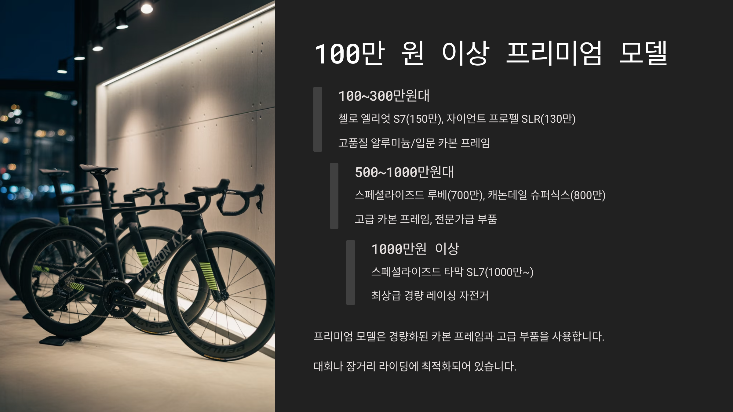 100만 원 이상이 되면 본격적인 퍼포먼스 자전거가 되기 시작해요. 카본 프레임, 고급형 그룹셋, 경량 설계가 적용돼서 장거리 주행이나 대회에도 적합하답니다.