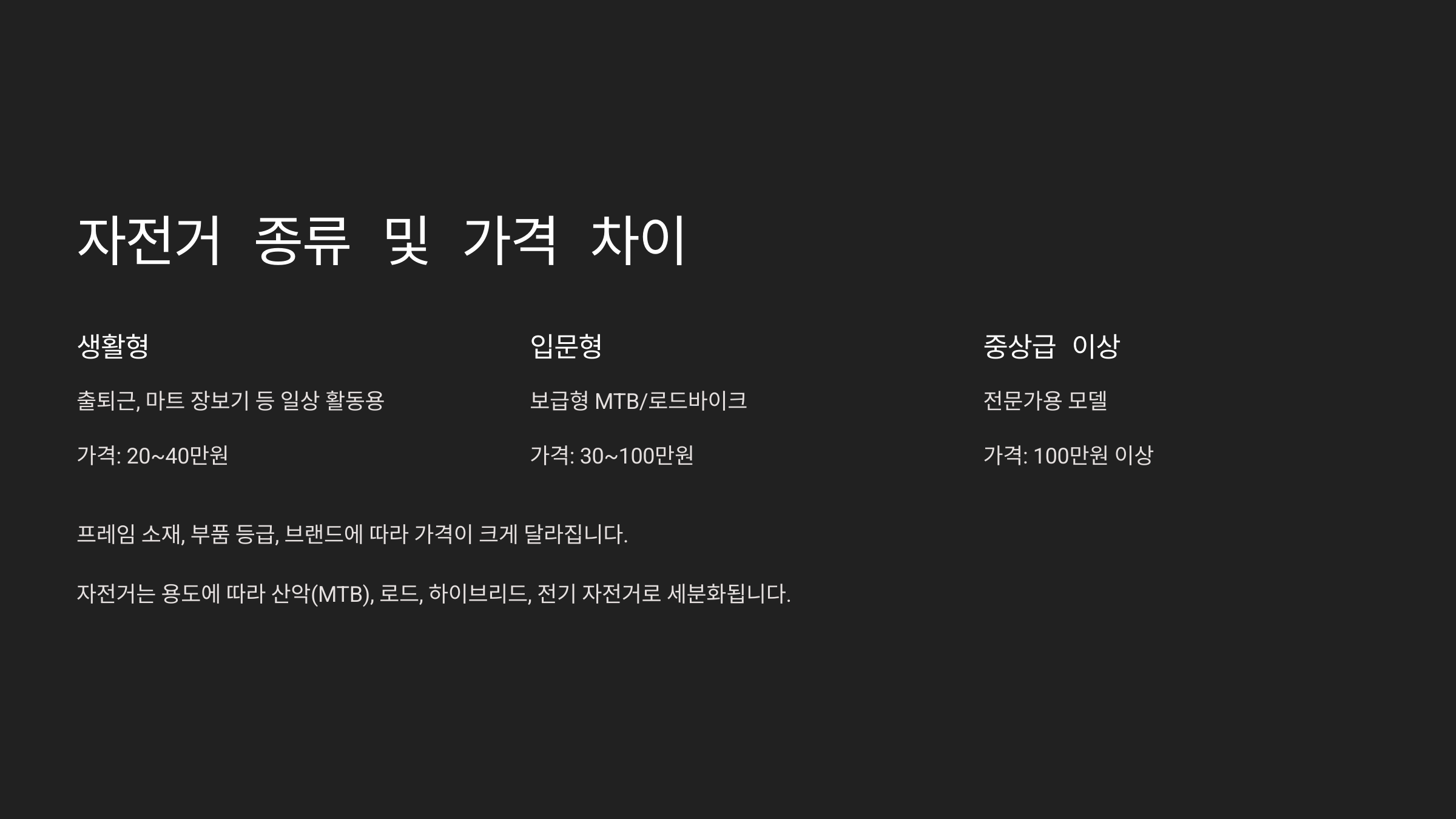 자전거 종류에 따라 가격대가 다르게 형성돼요. 대표적인 종류는 로드바이크, MTB(산악자전거), 하이브리드, 전기자전거, 미니벨로 등이 있어요. 각각 쓰임새가 다르기 때문에 목적에 맞게 골라야 해요.