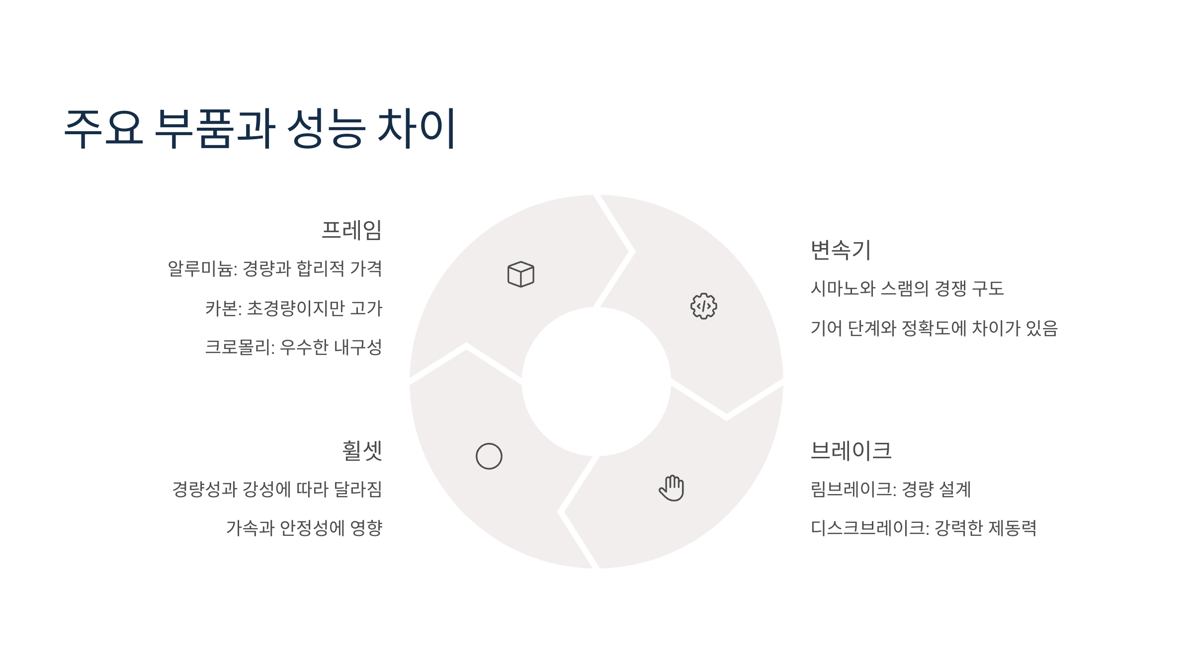 자전거에서 성능을 결정짓는 요소는 프레임뿐만이 아니에요. 기어, 브레이크, 휠셋, 서스펜션 등 주요 부품의 조합이 전체 라이딩 품질을 좌우하죠. 브랜드가 같은 자전거라도 사양이 다르면 전혀 다른 느낌을 받을 수 있어요.