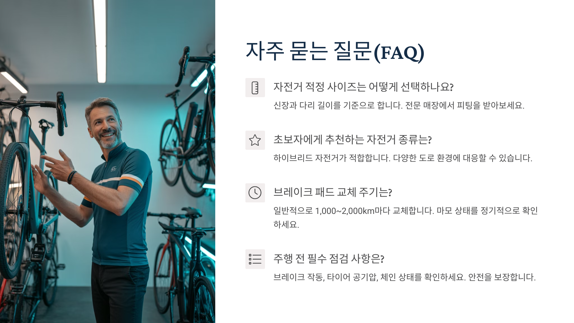 Q1. 자전거 입문용으로 가장 좋은 브랜드는?A1. 가성비와 정비 편의성을 고려해 GIANT, 메리다, 트렉의 보급형 모델이 좋아요.